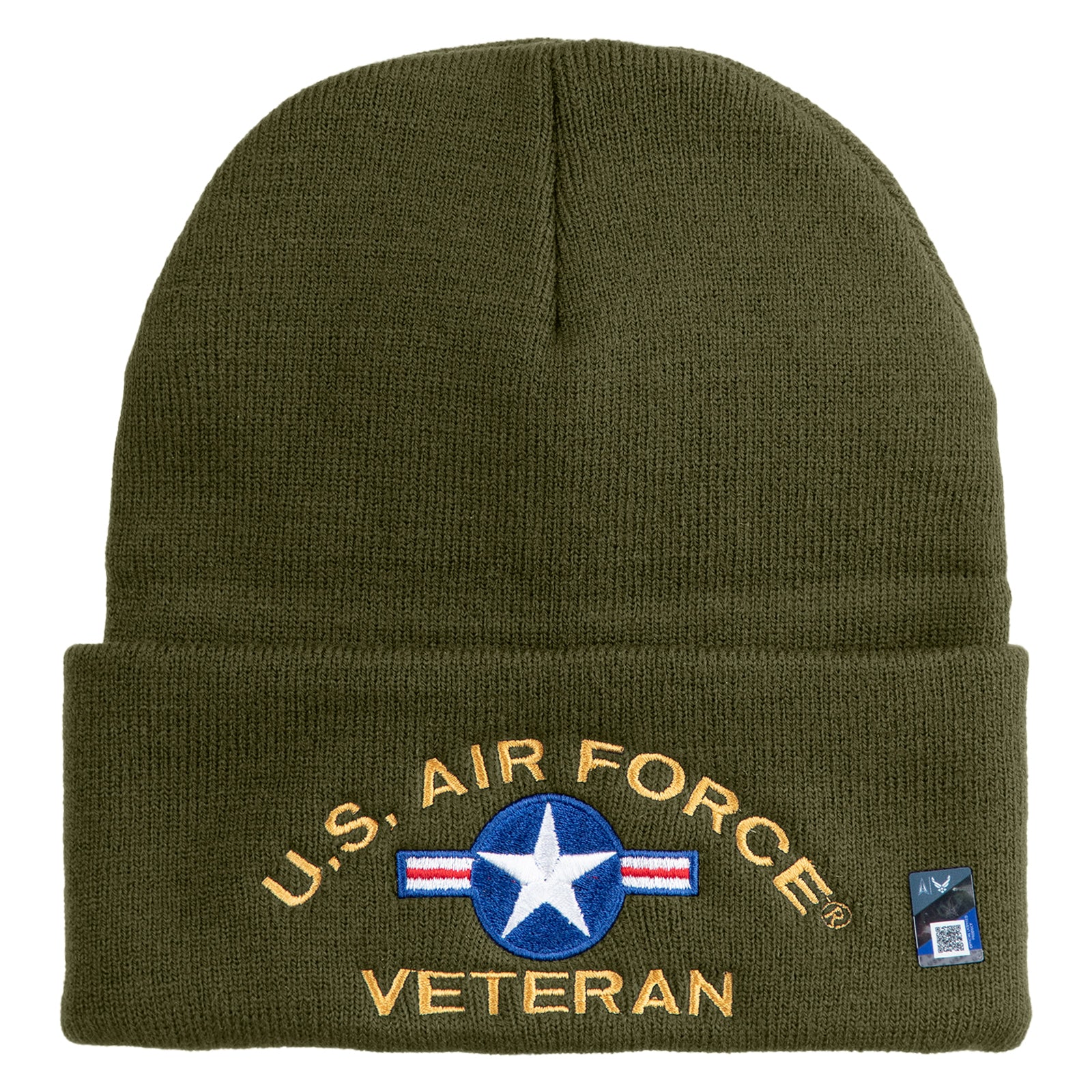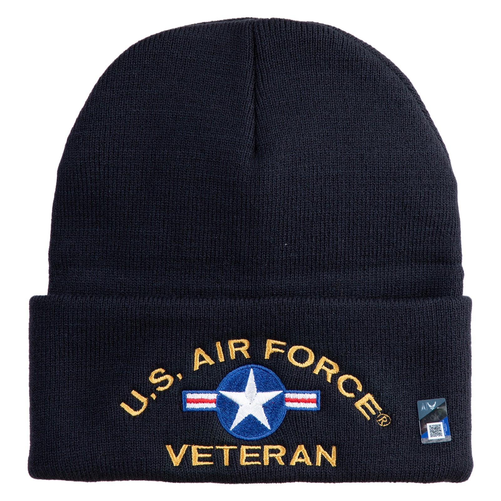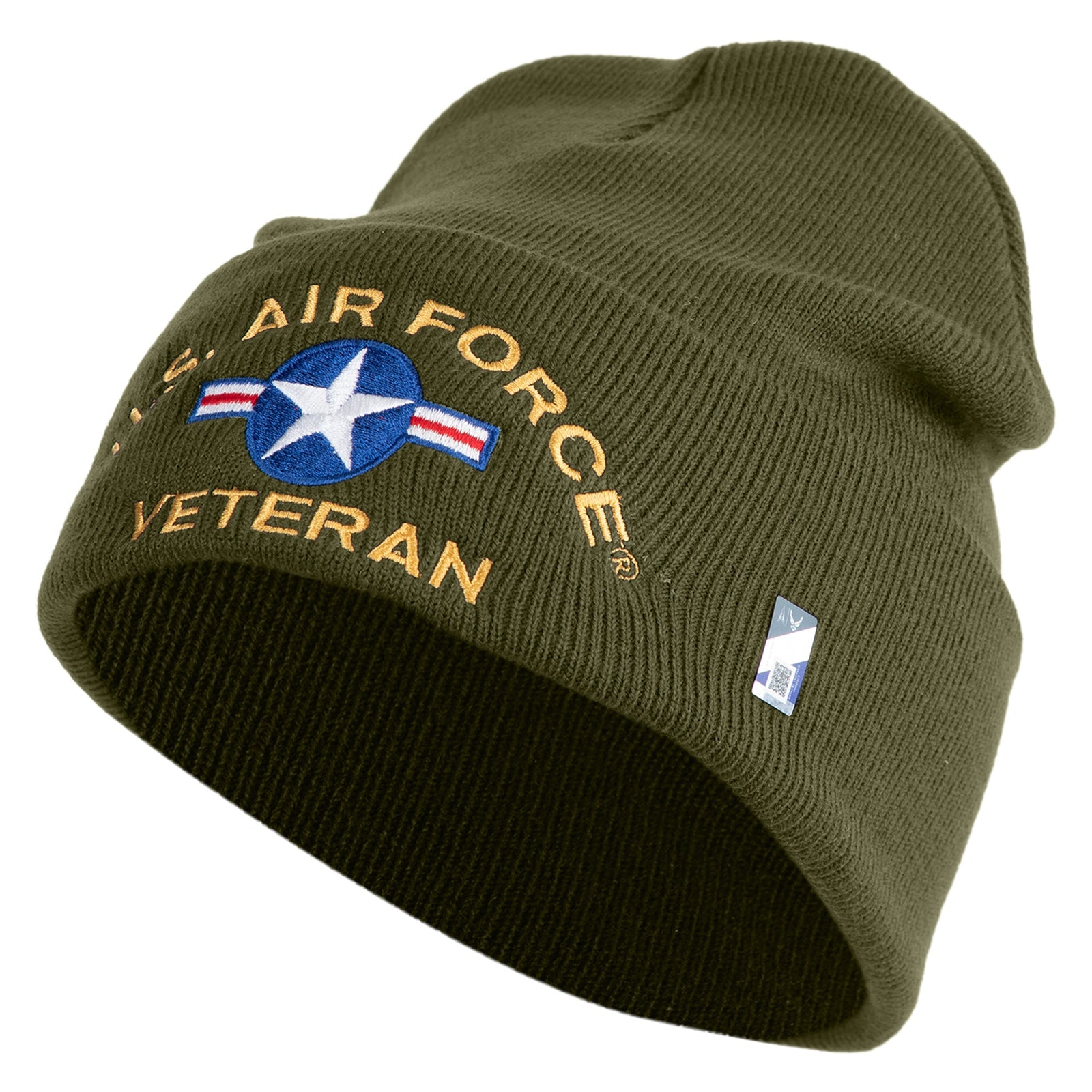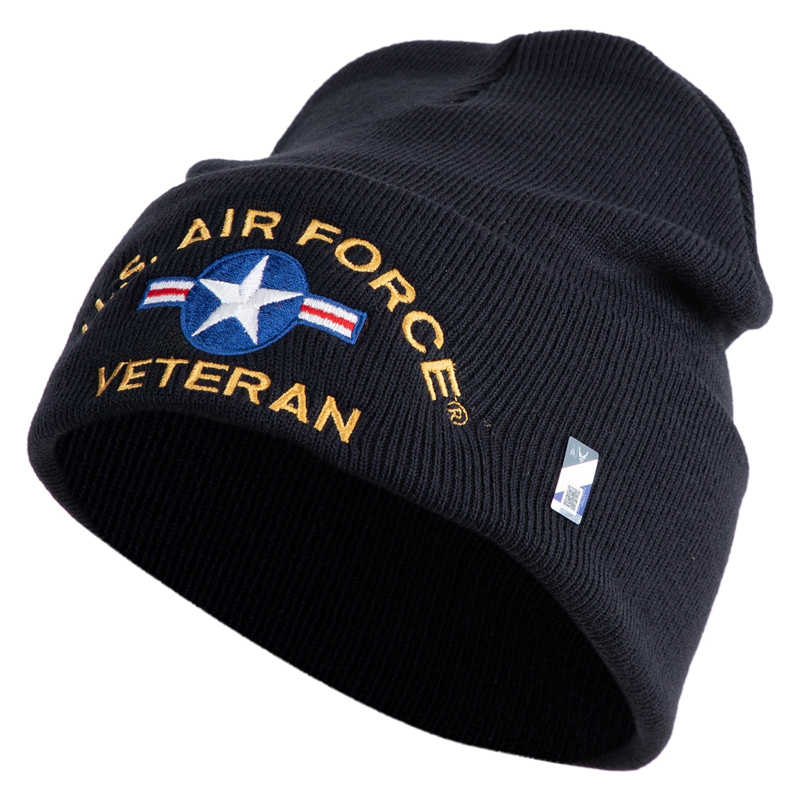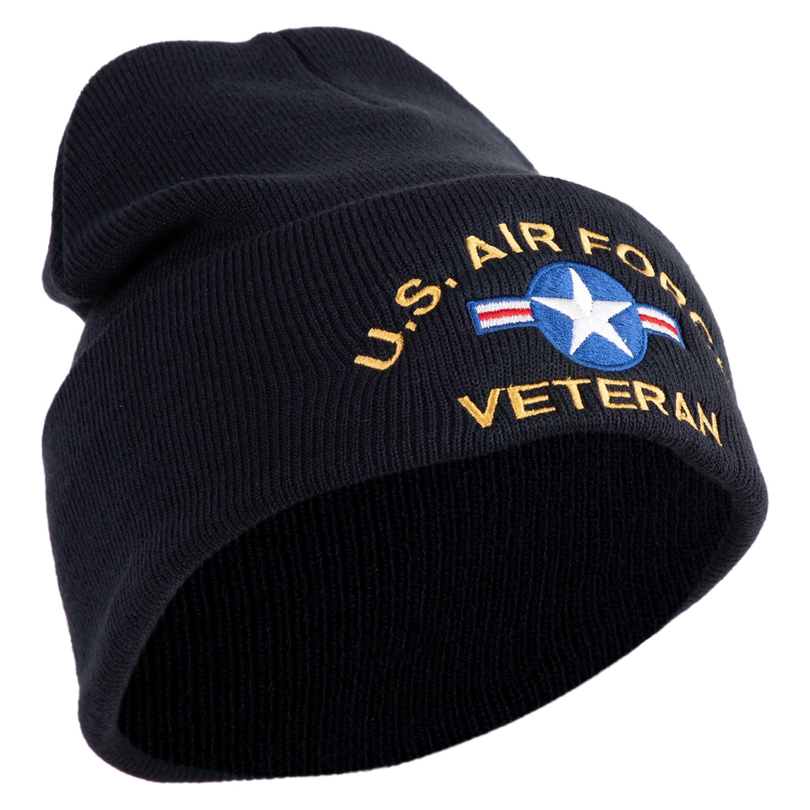 Title, U.S. Airforce Veteran with Roundel Logo Embroidered 12 Inch Solid Knit Cuff Long Beanie Made in USA