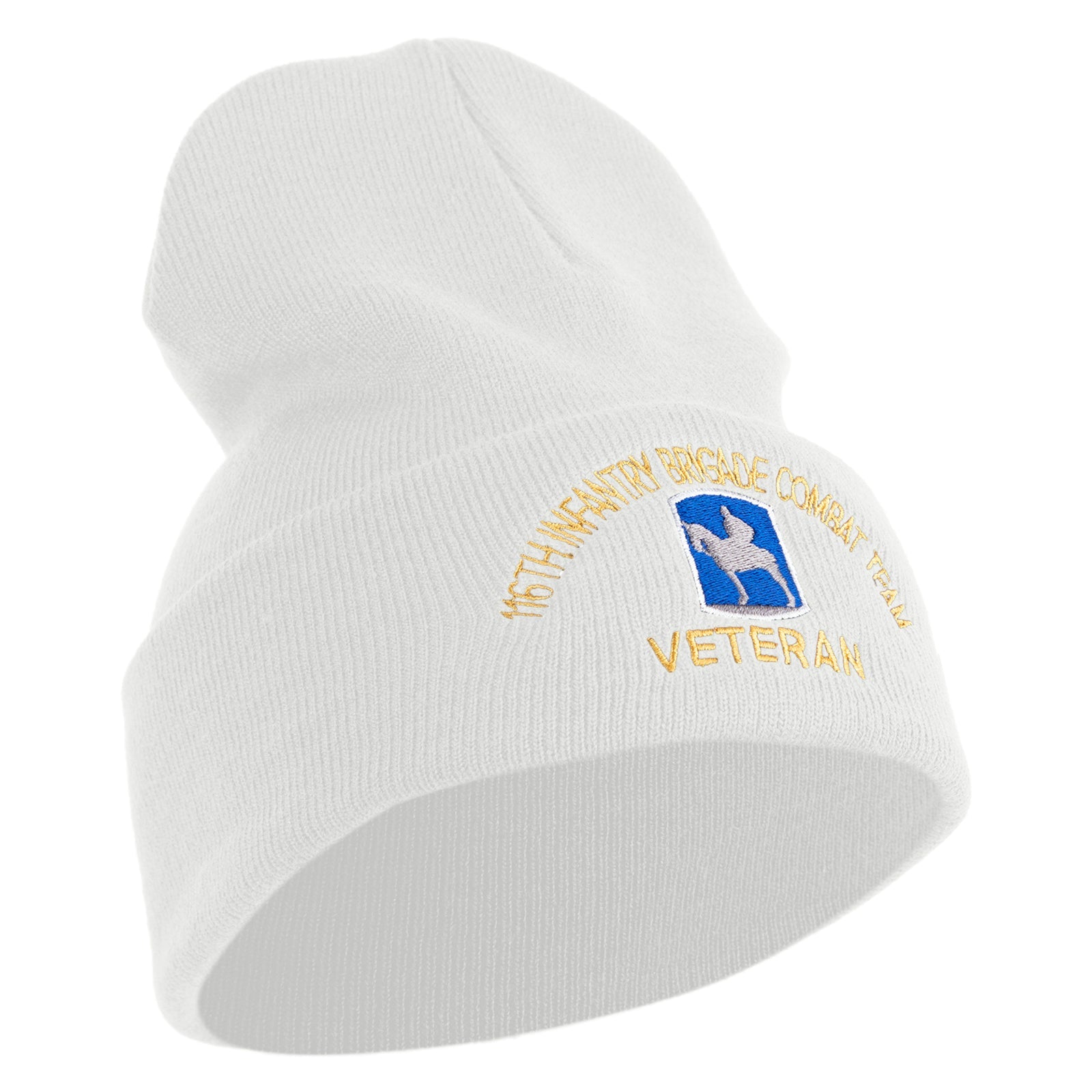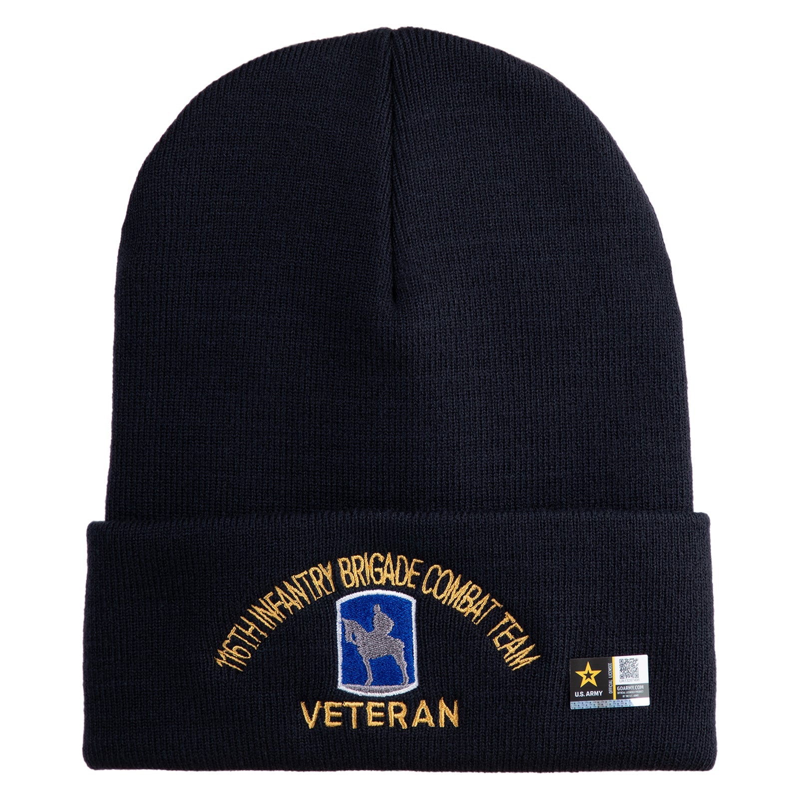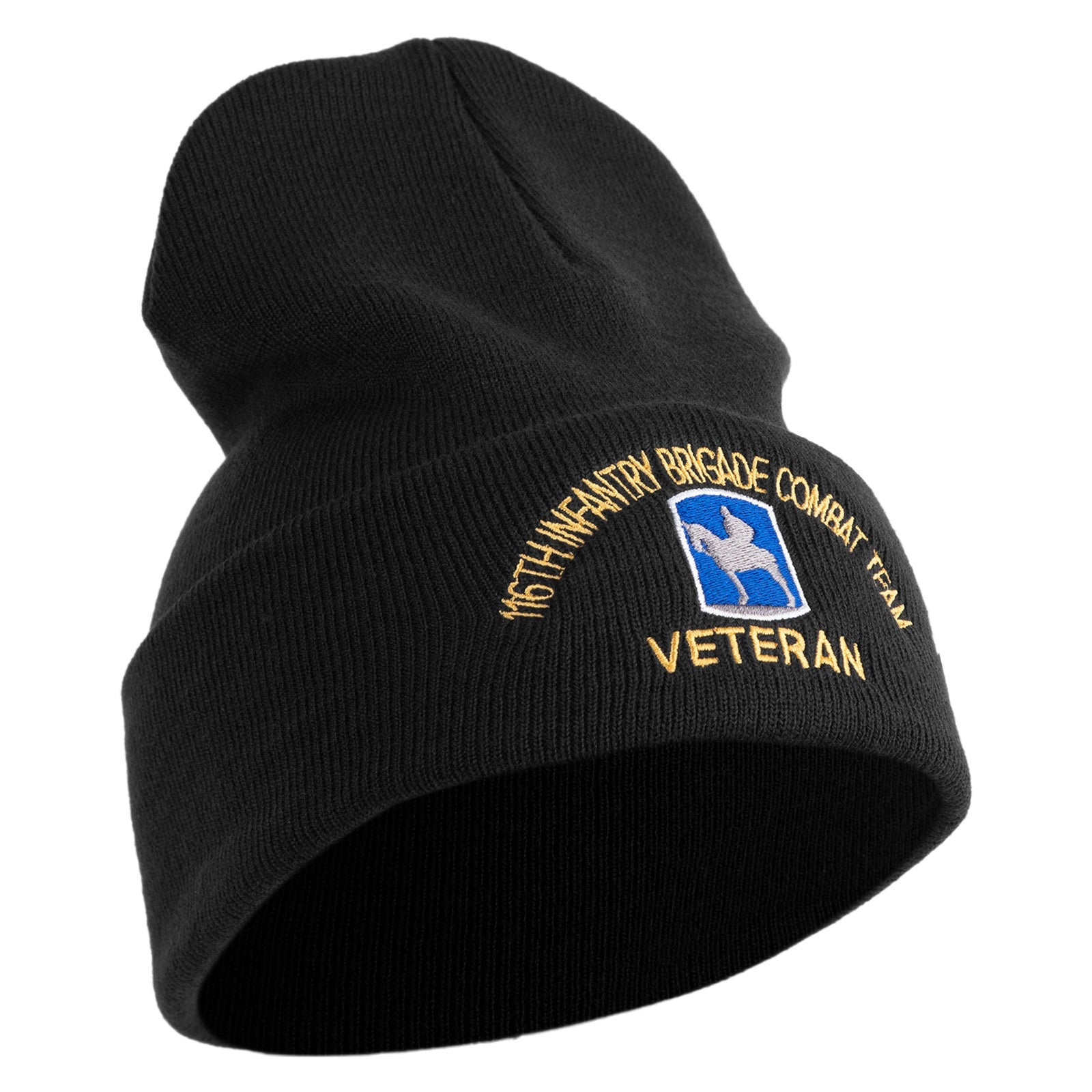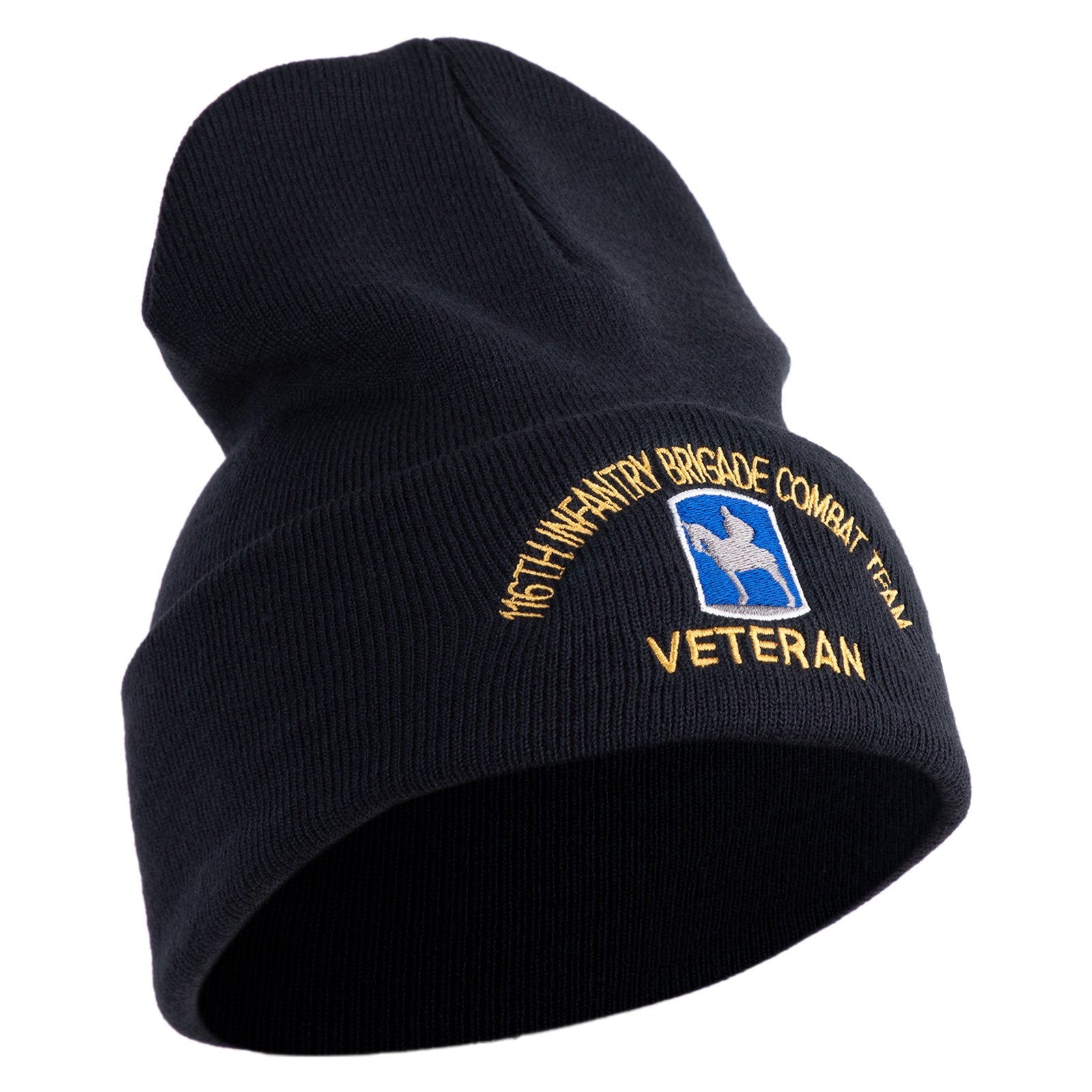 U.S. Army 116th Infantry Brigade Combat Team Logo Embroidered 12 Inch Solid Knit Cuff Long Beanie Made in USA