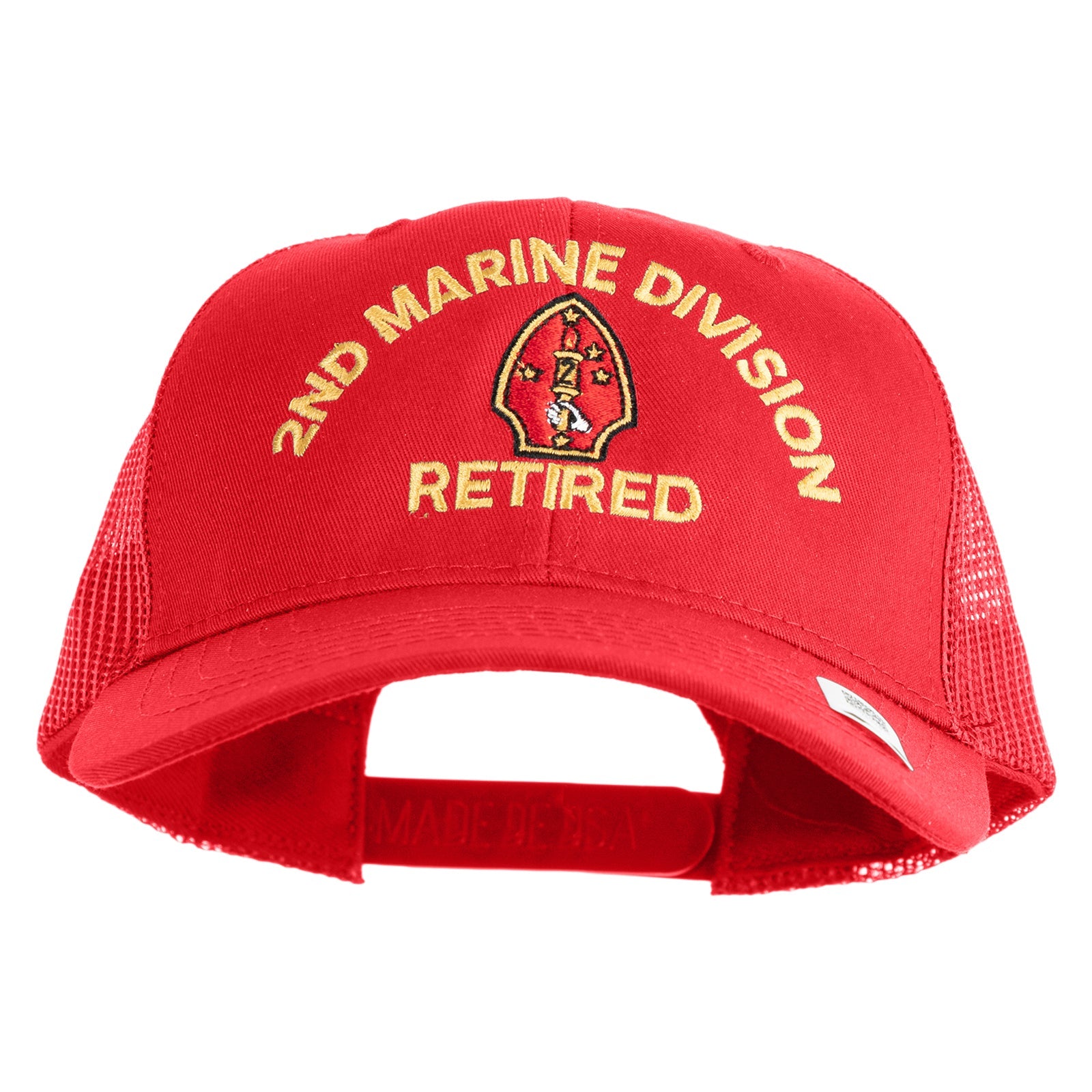 Title, 2nd Marine Division Retired Embroidered 6 Panel Structured Cotton Twill Mesh Cap Made in USA