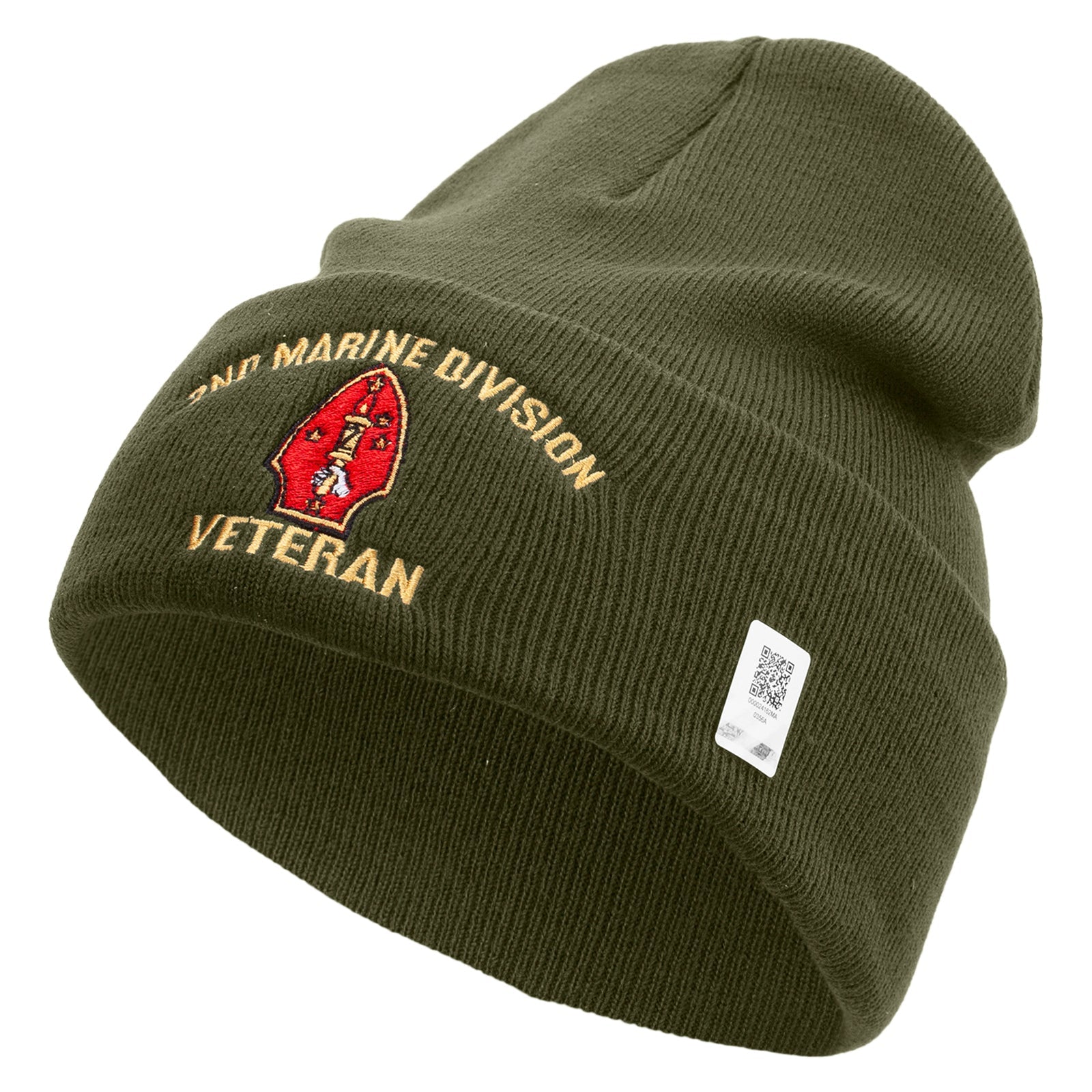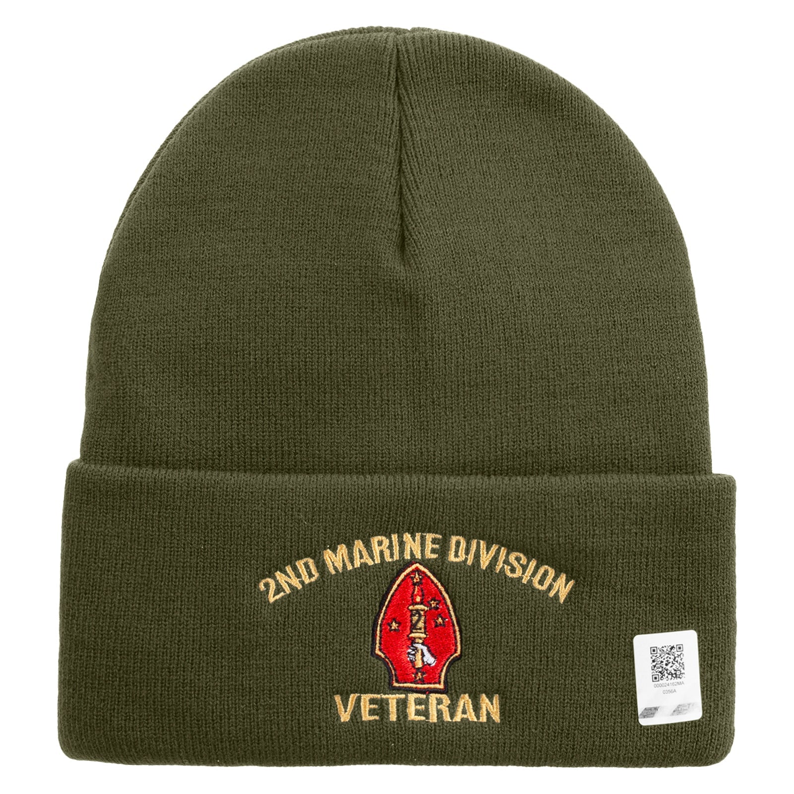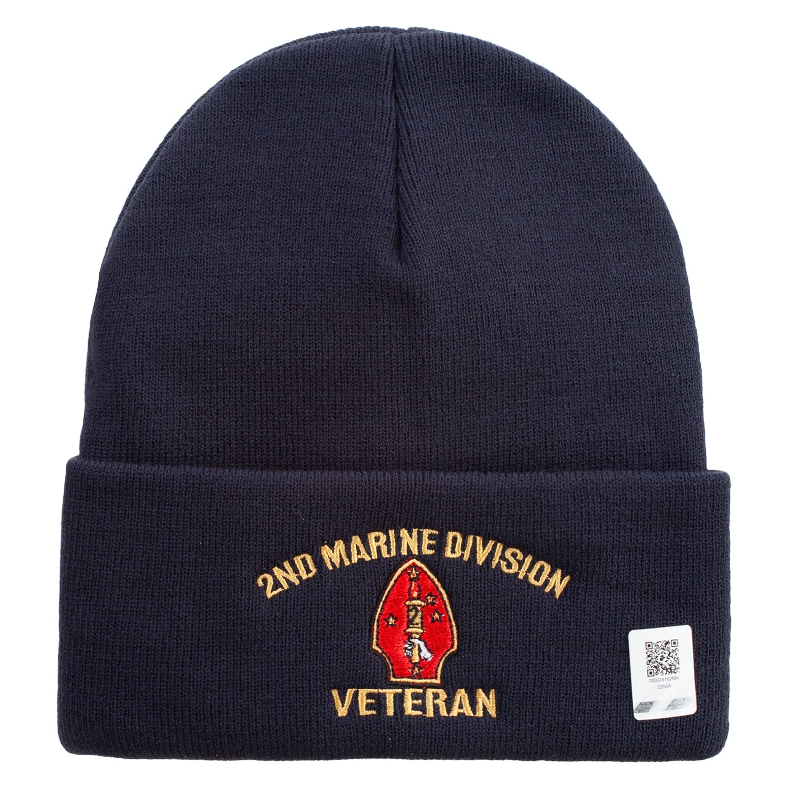 Title, 2nd Marine Division Veteran Logo Embroidered 12 Inch Solid Knit Cuff Long Beanie Made in USA