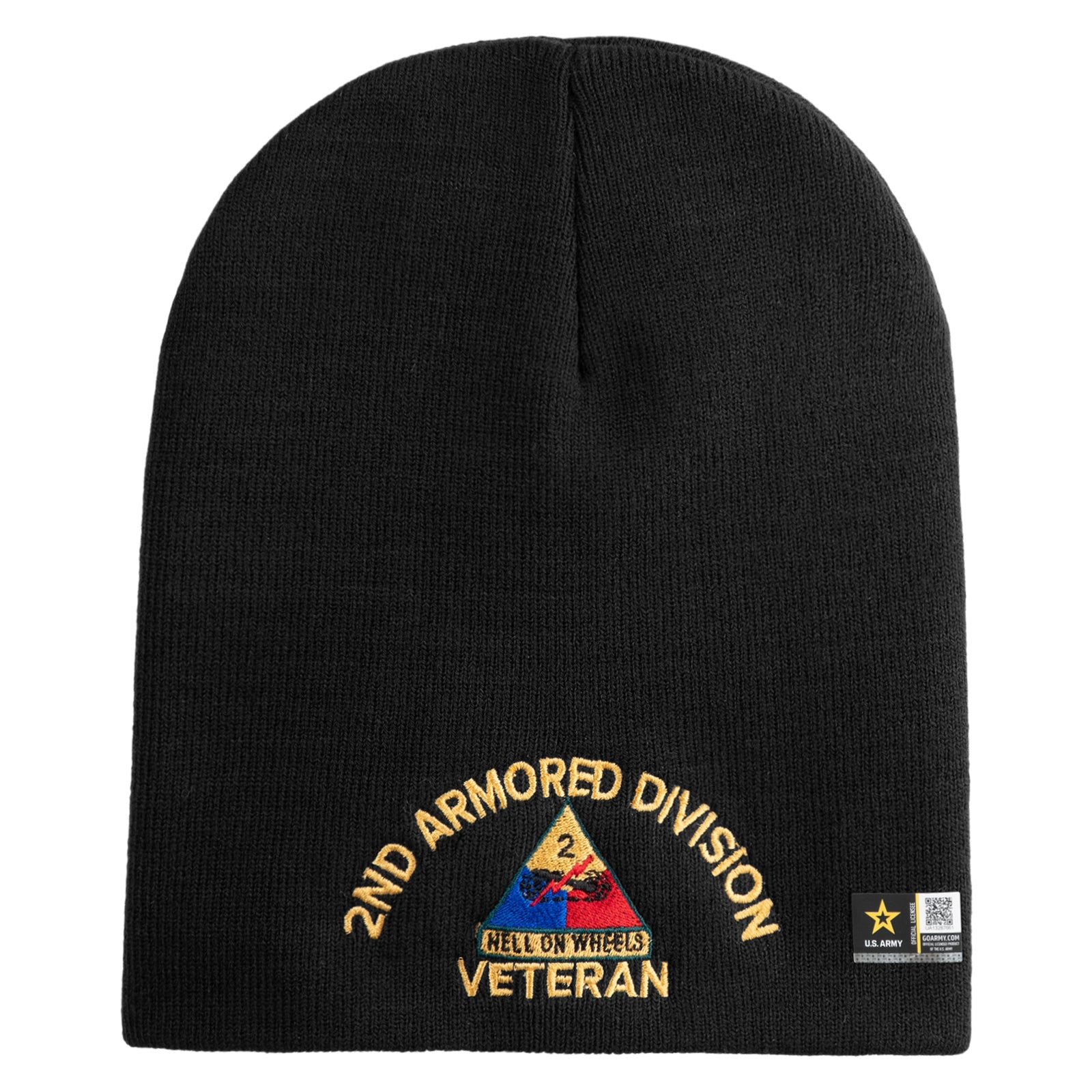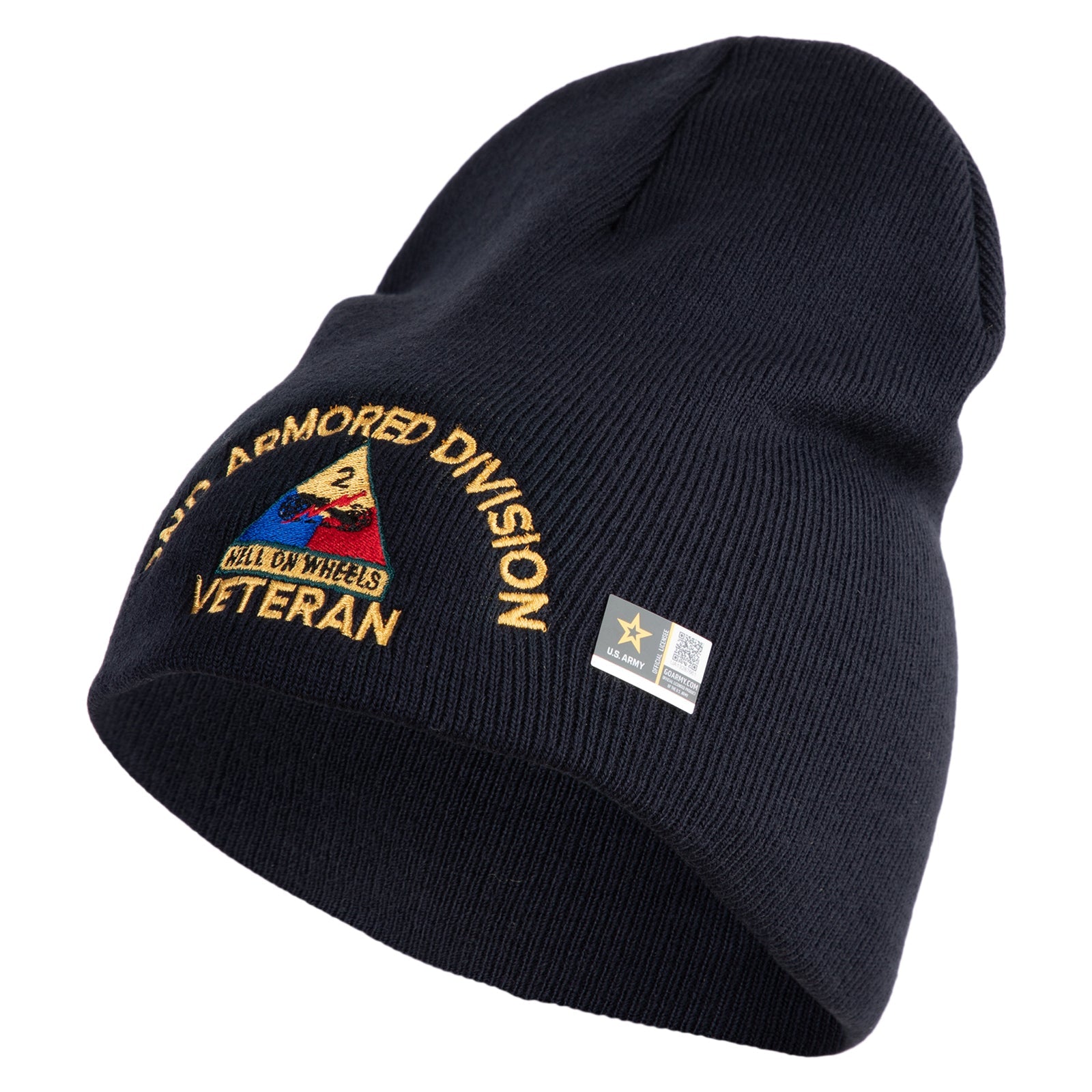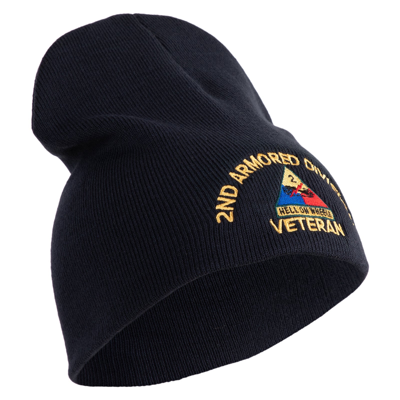 U.S. Army 2nd Armored Division Symbol Embroidered 8 Inch Solid Knit Short Beanie Made in USA