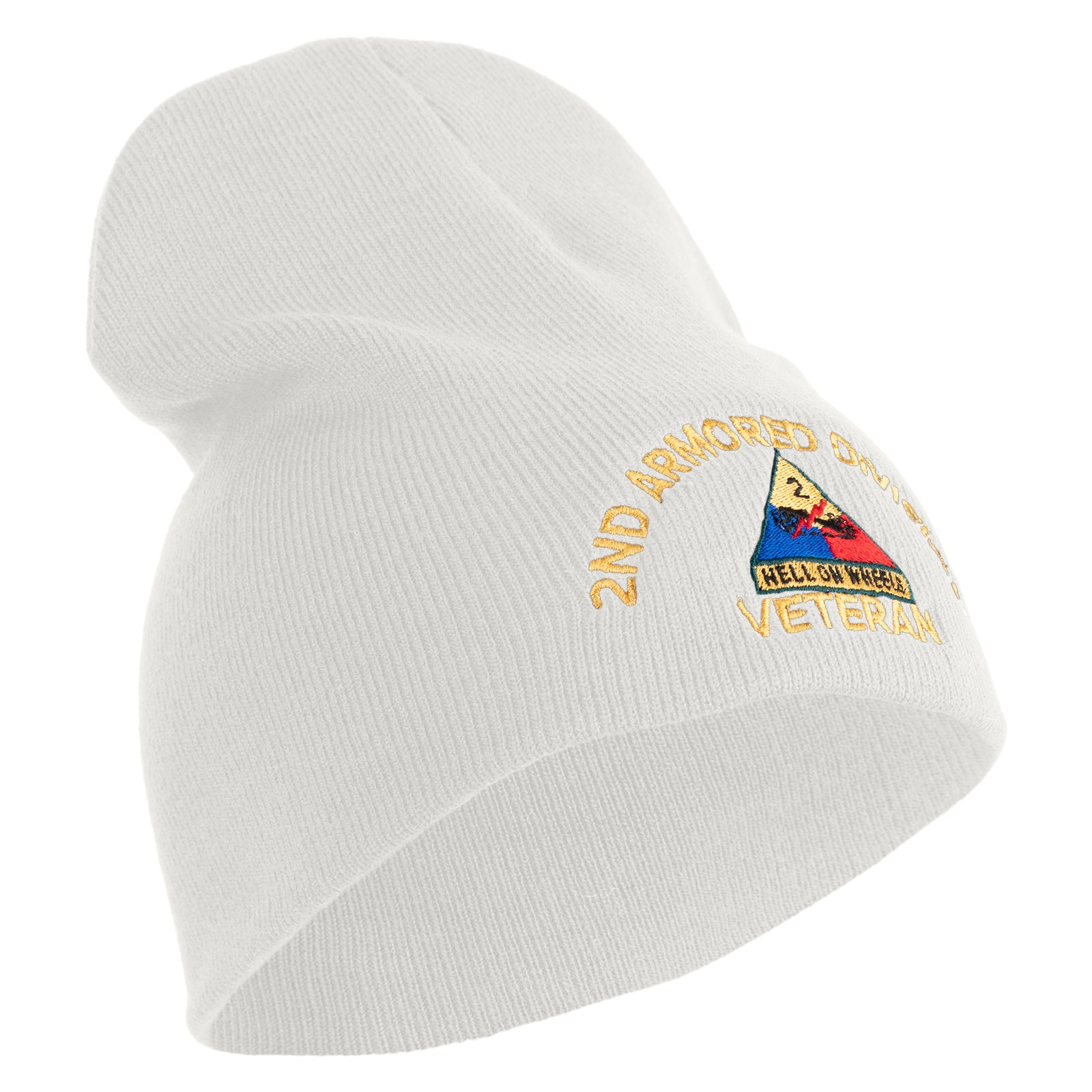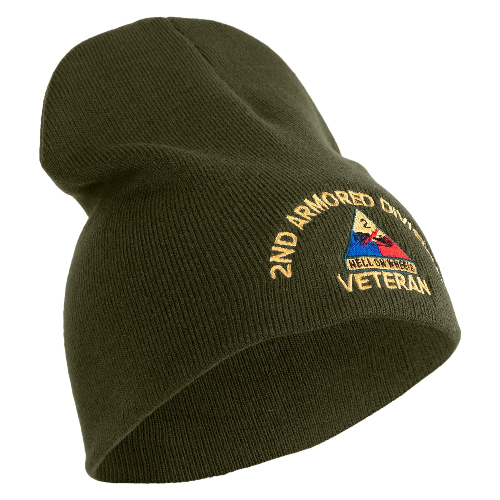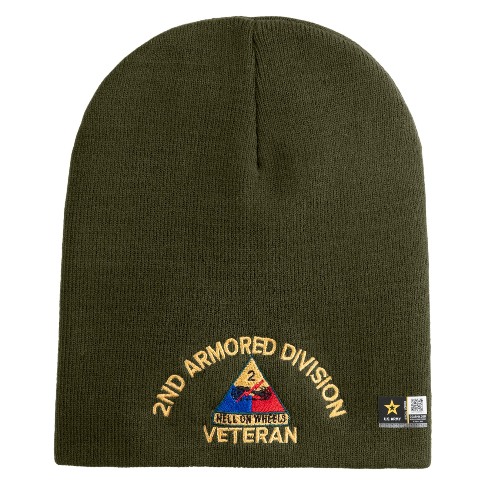 U.S. Army 2nd Armored Division Symbol Embroidered 8 Inch Solid Knit Short Beanie Made in USA