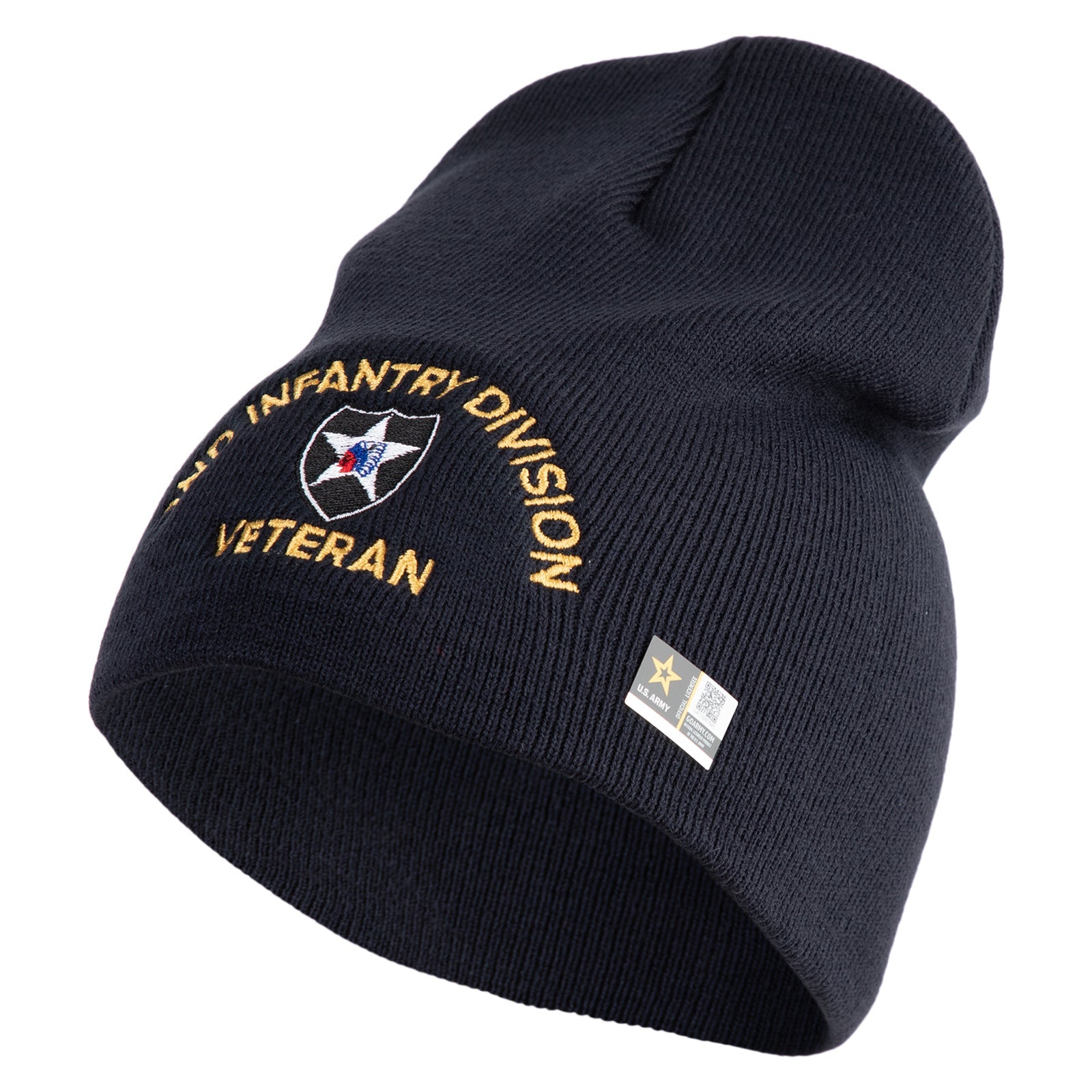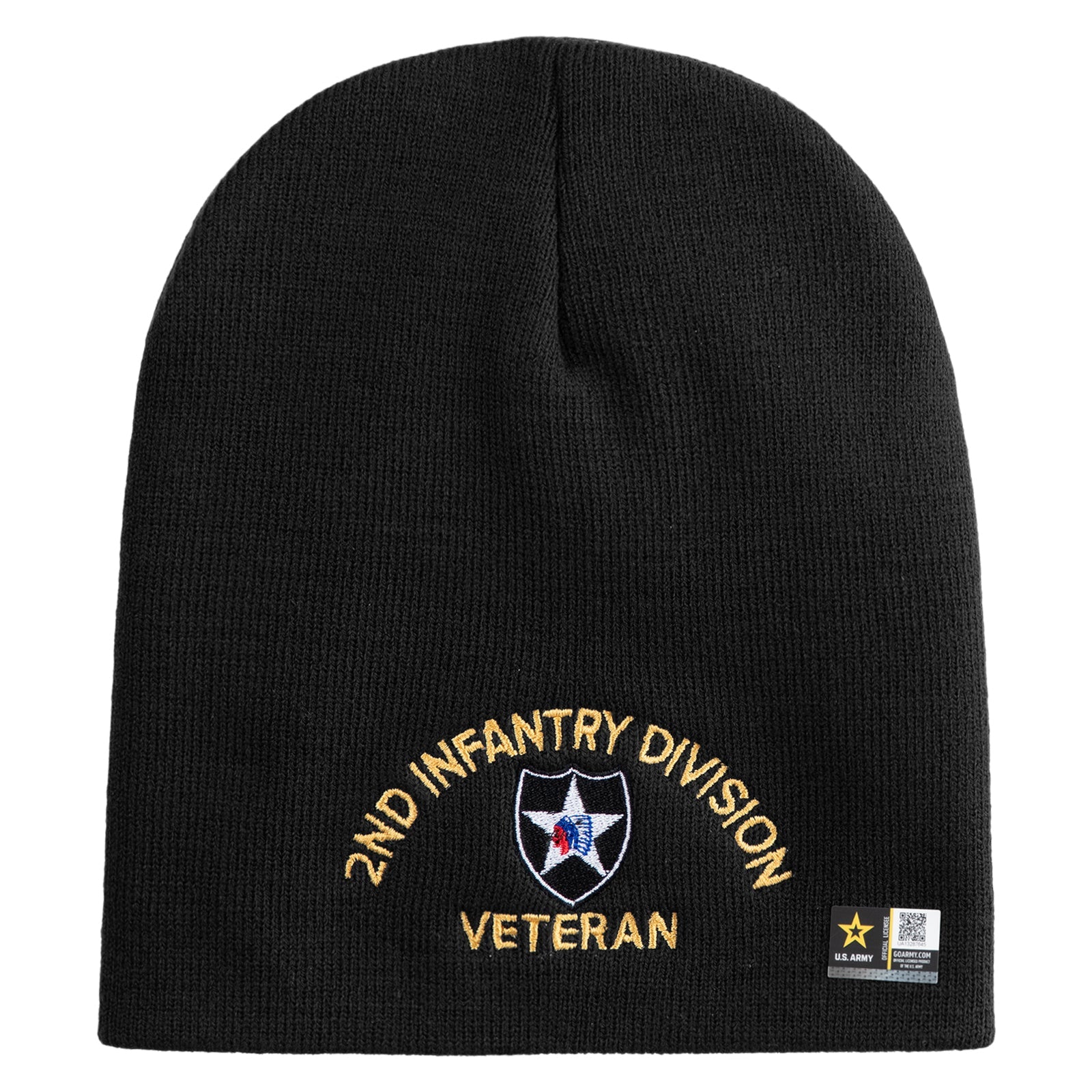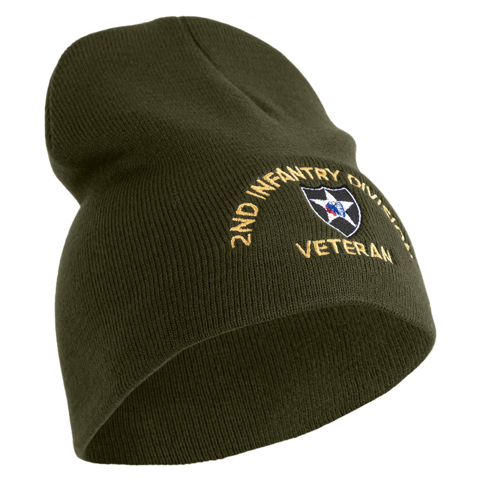 U.S. Army 2nd Infantry Division Symbol Embroidered 8 Inch Solid Knit Short Beanie Made in USA