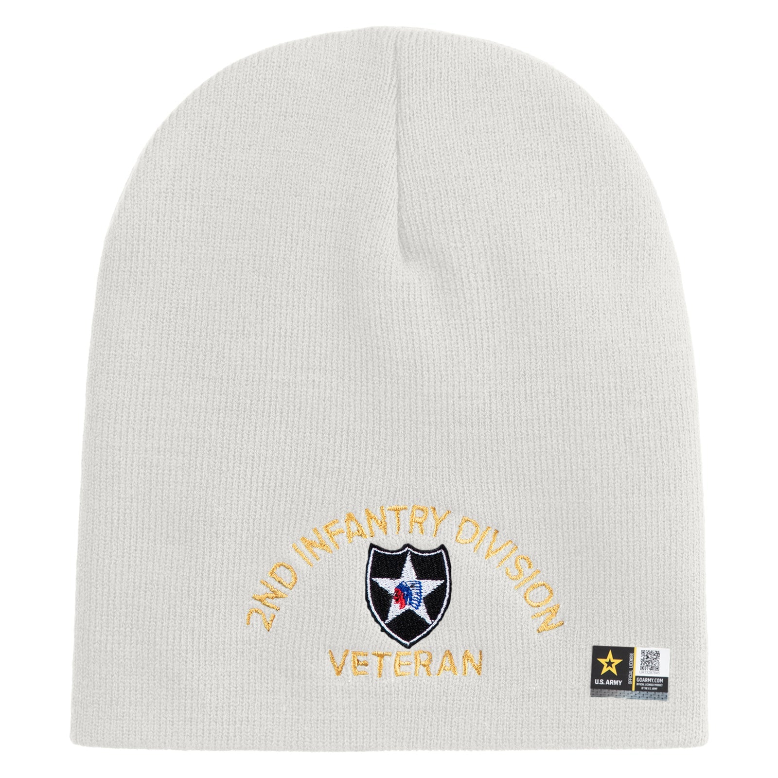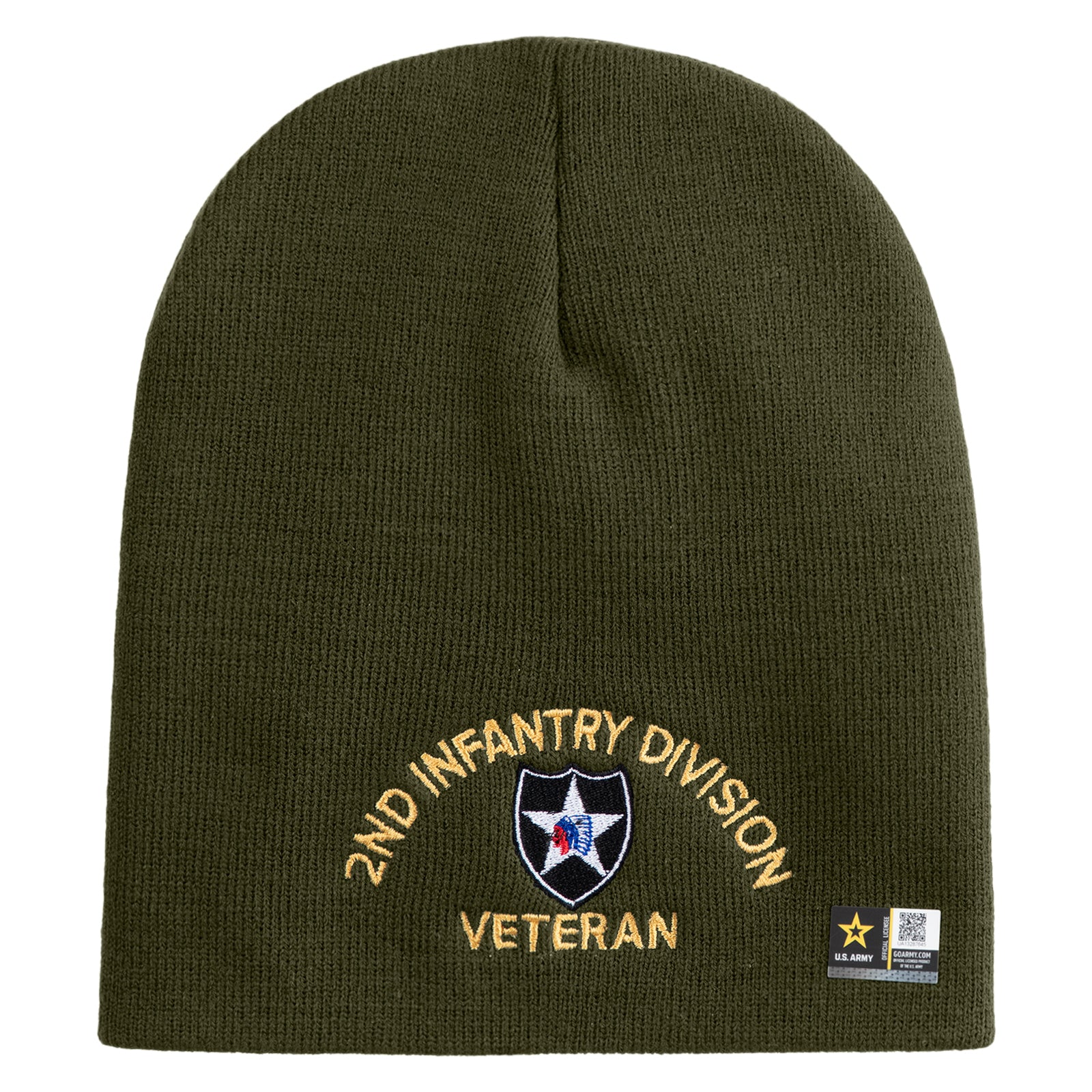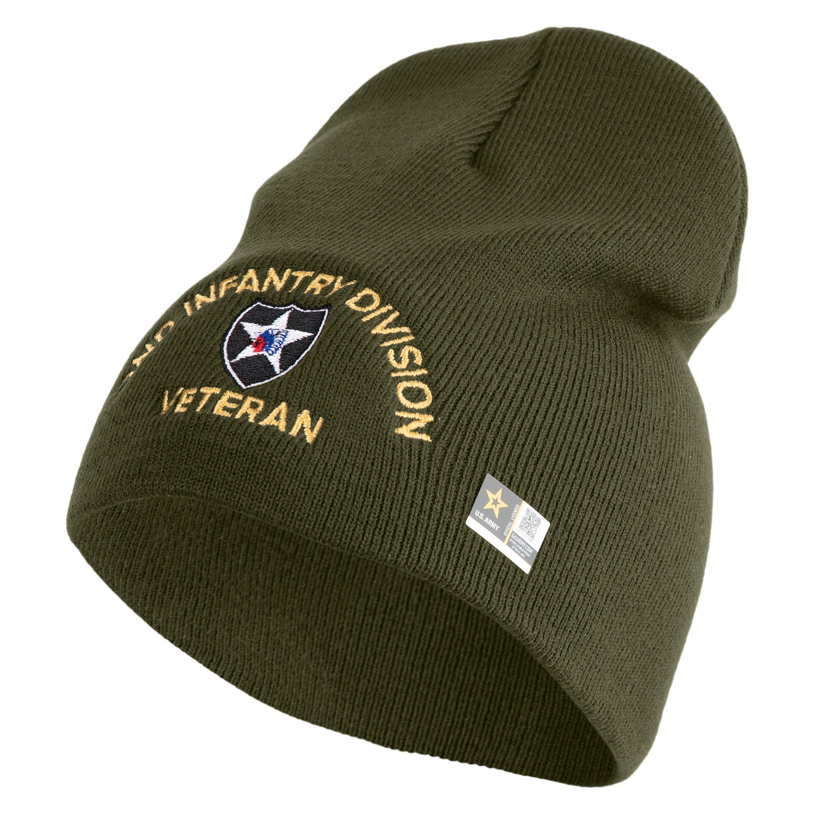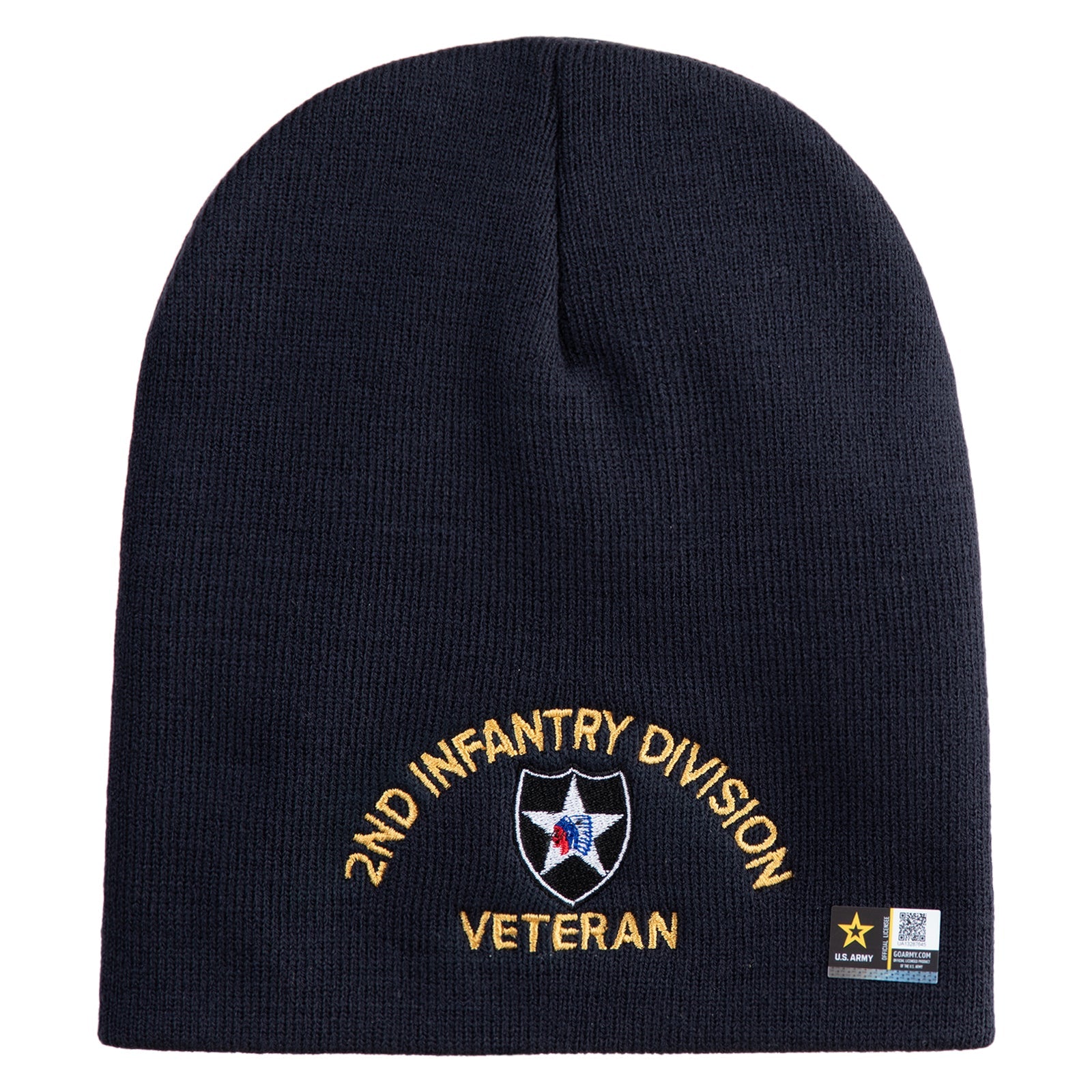 U.S. Army 2nd Infantry Division Symbol Embroidered 8 Inch Solid Knit Short Beanie Made in USA