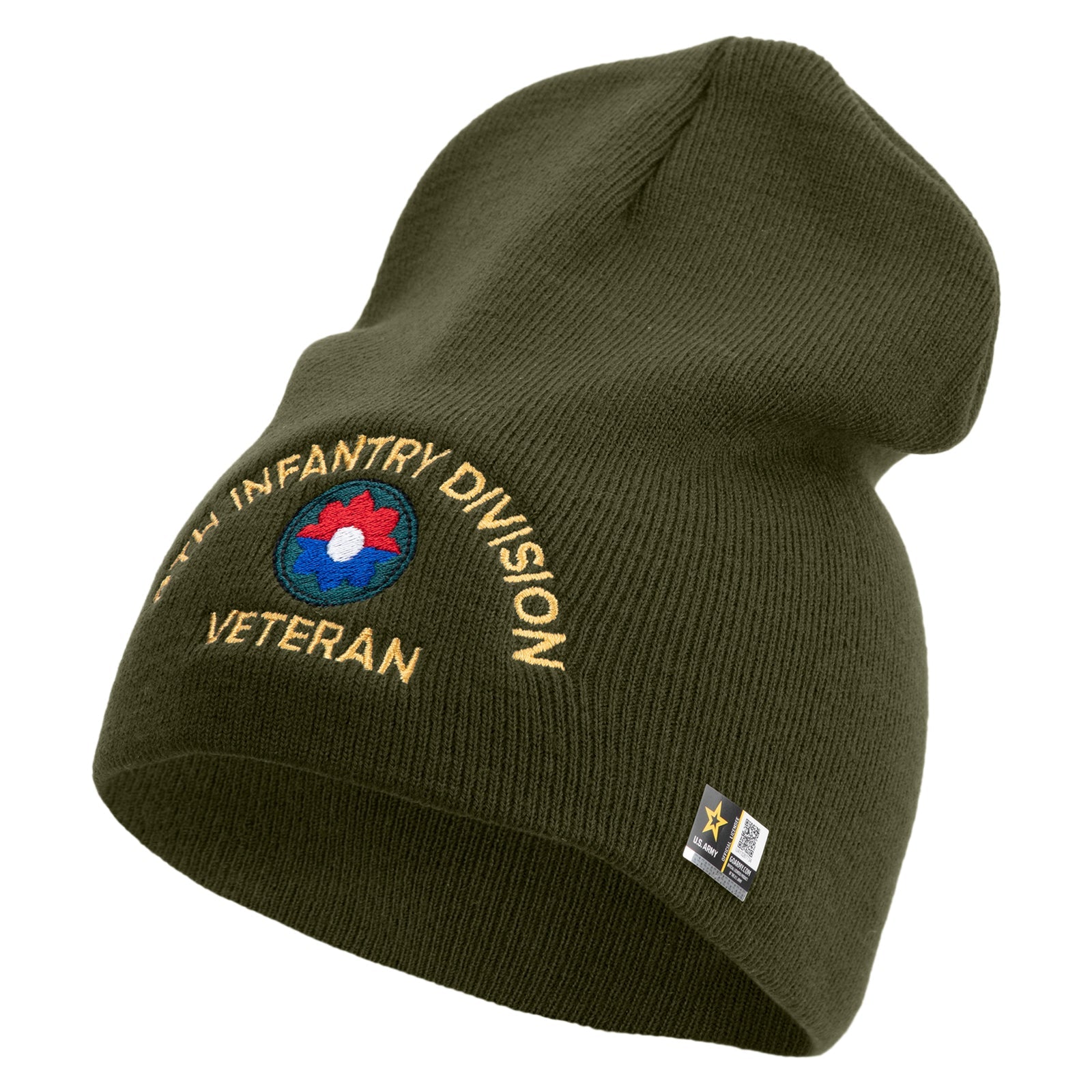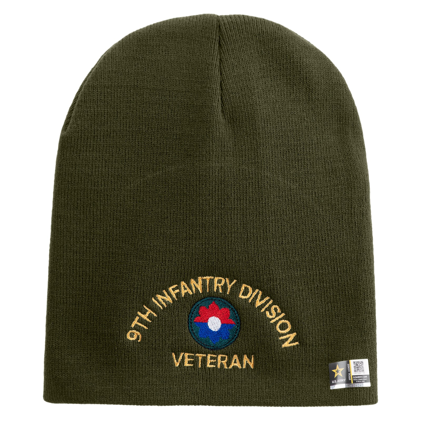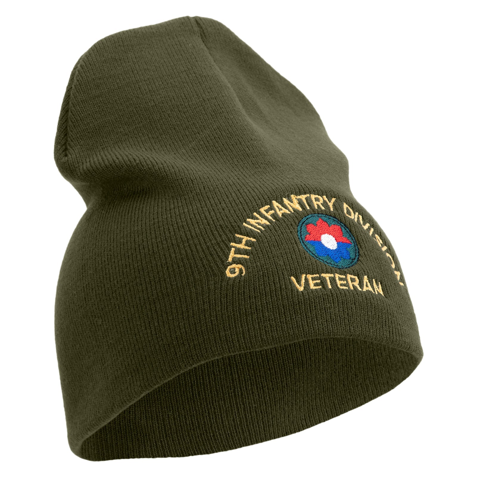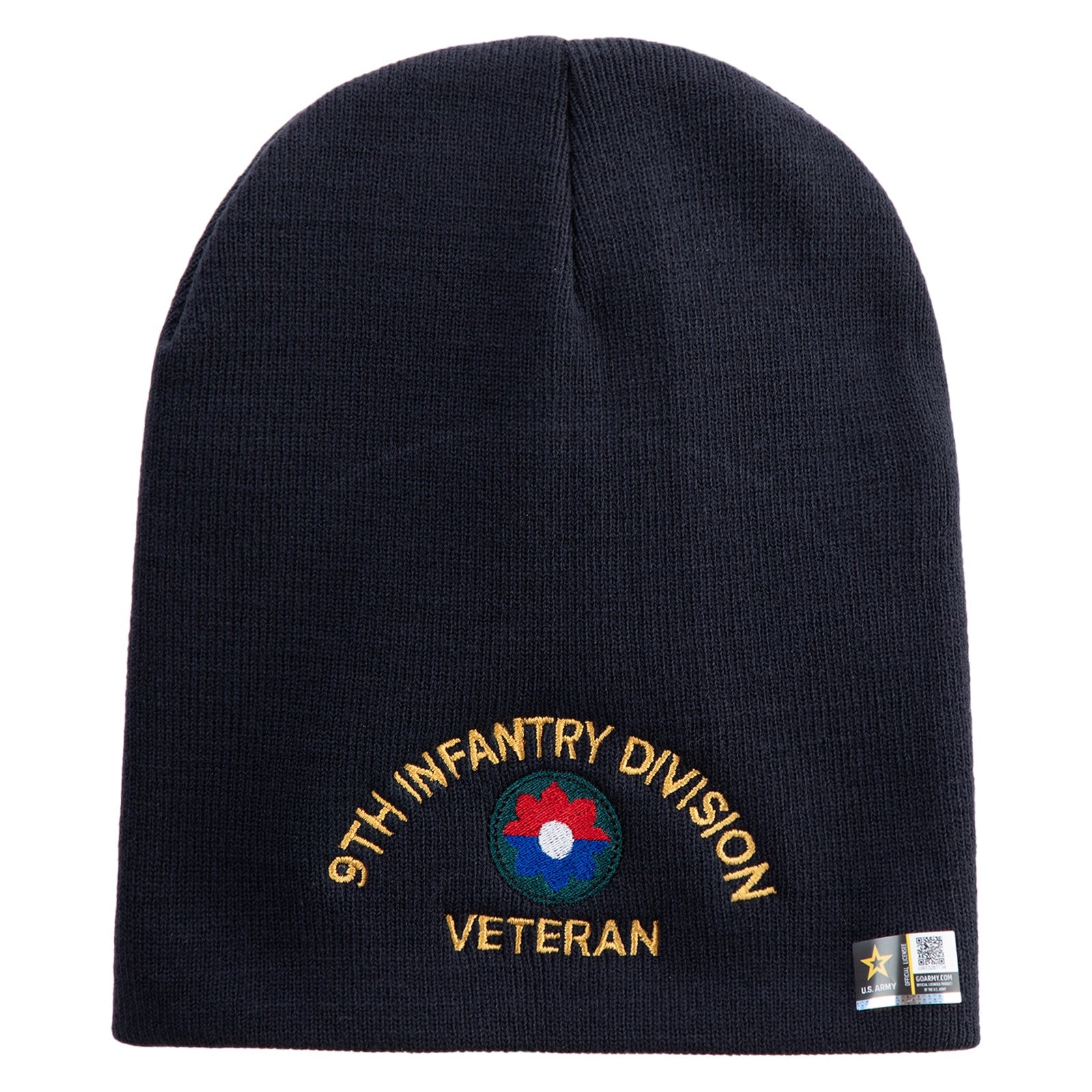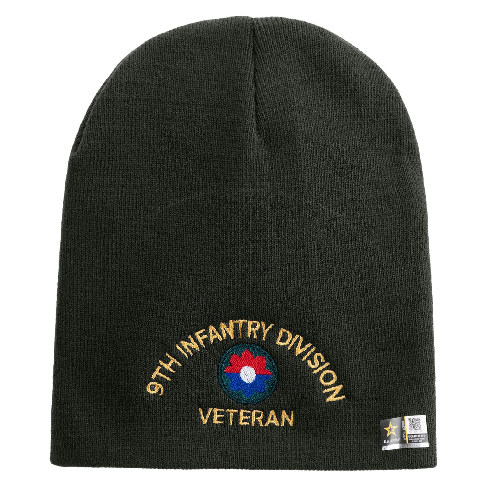 Title, U.S. Army 9th Infantry Division Symbol Embroidered 8 Inch Solid Knit Short Beanie Made in USA