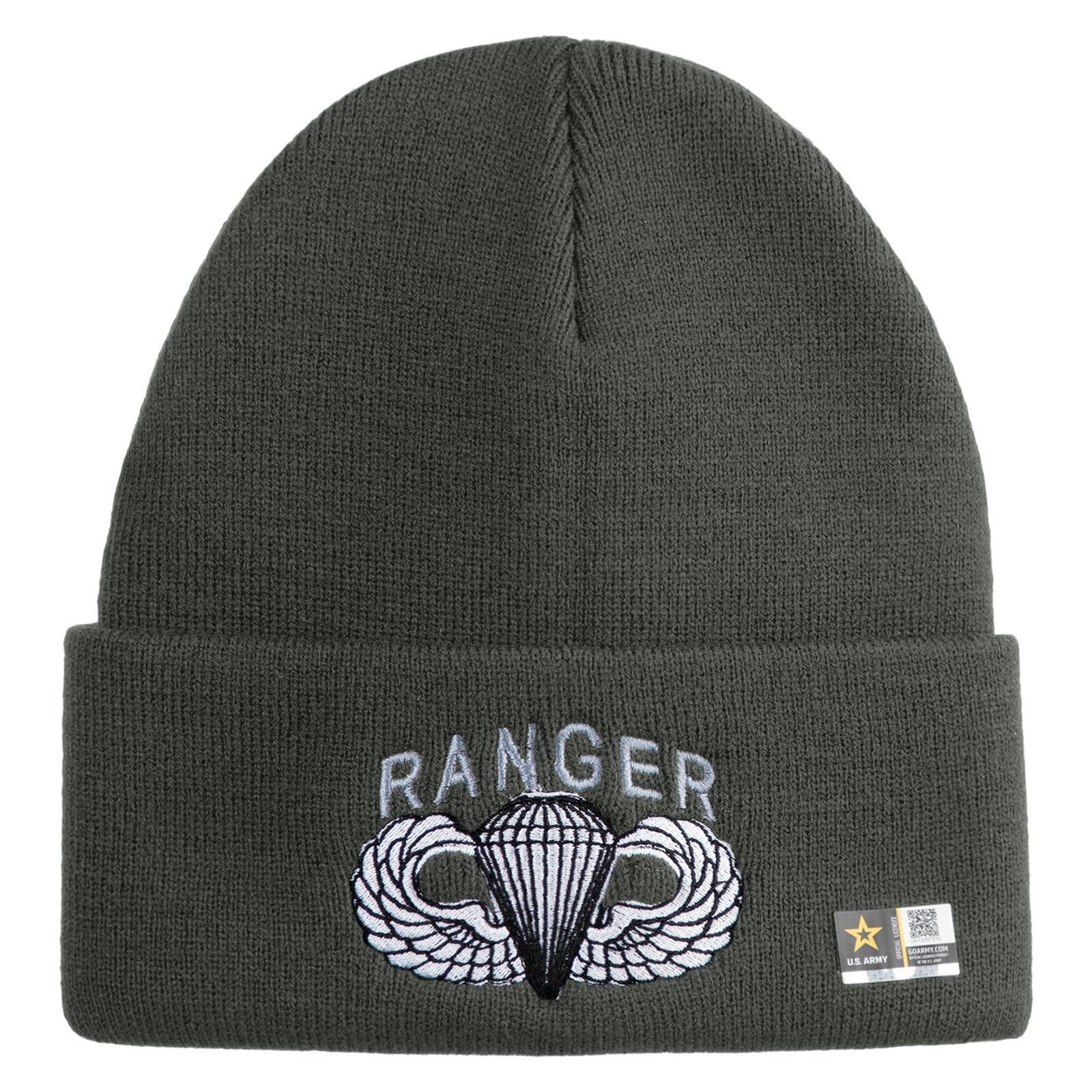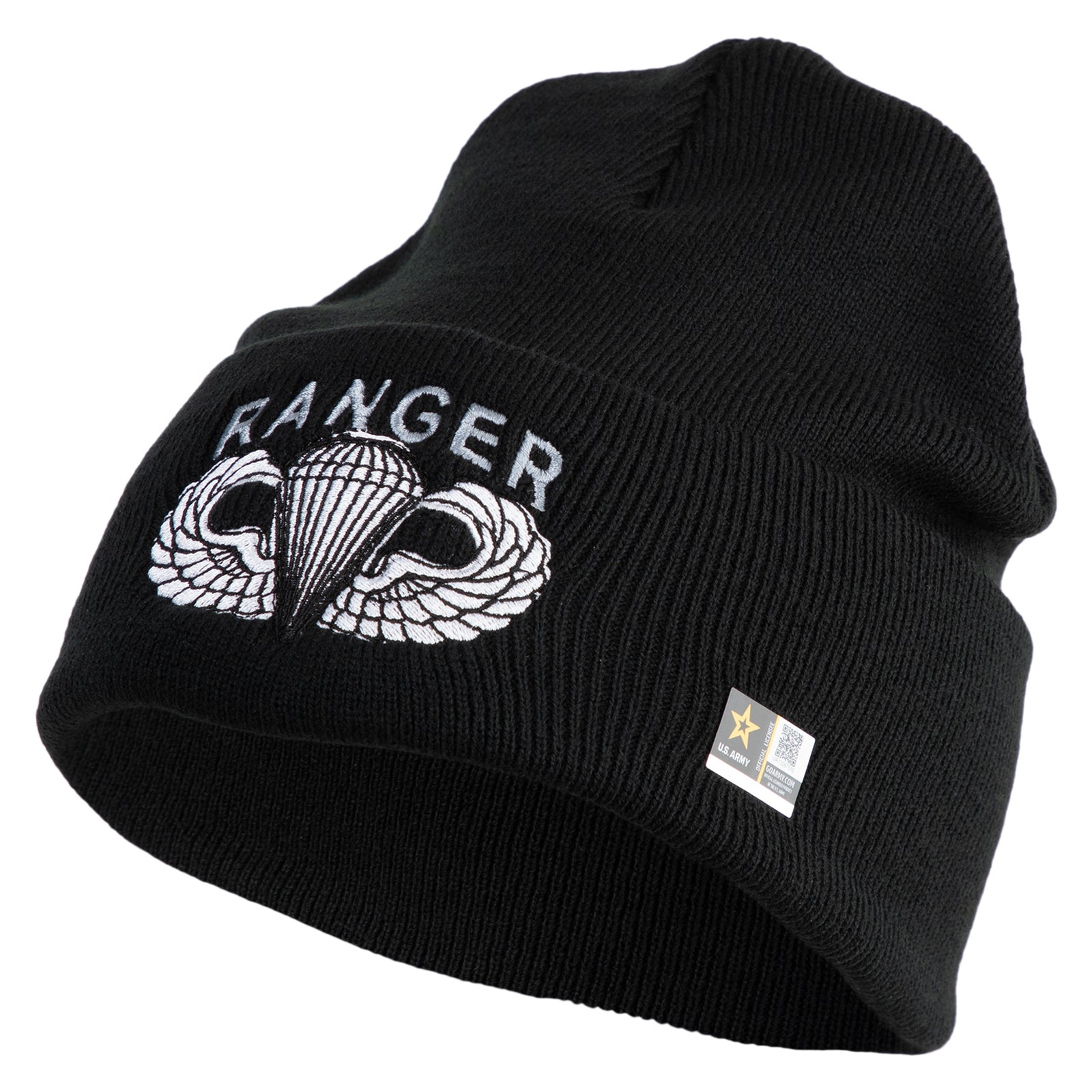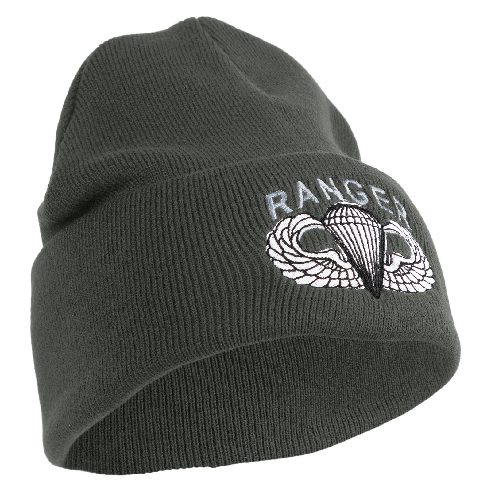 U.S. Army Paratrooper and Ranger Badge Logo Embroidered 12 Inch Solid Knit Cuff Long Beanie Made in USA