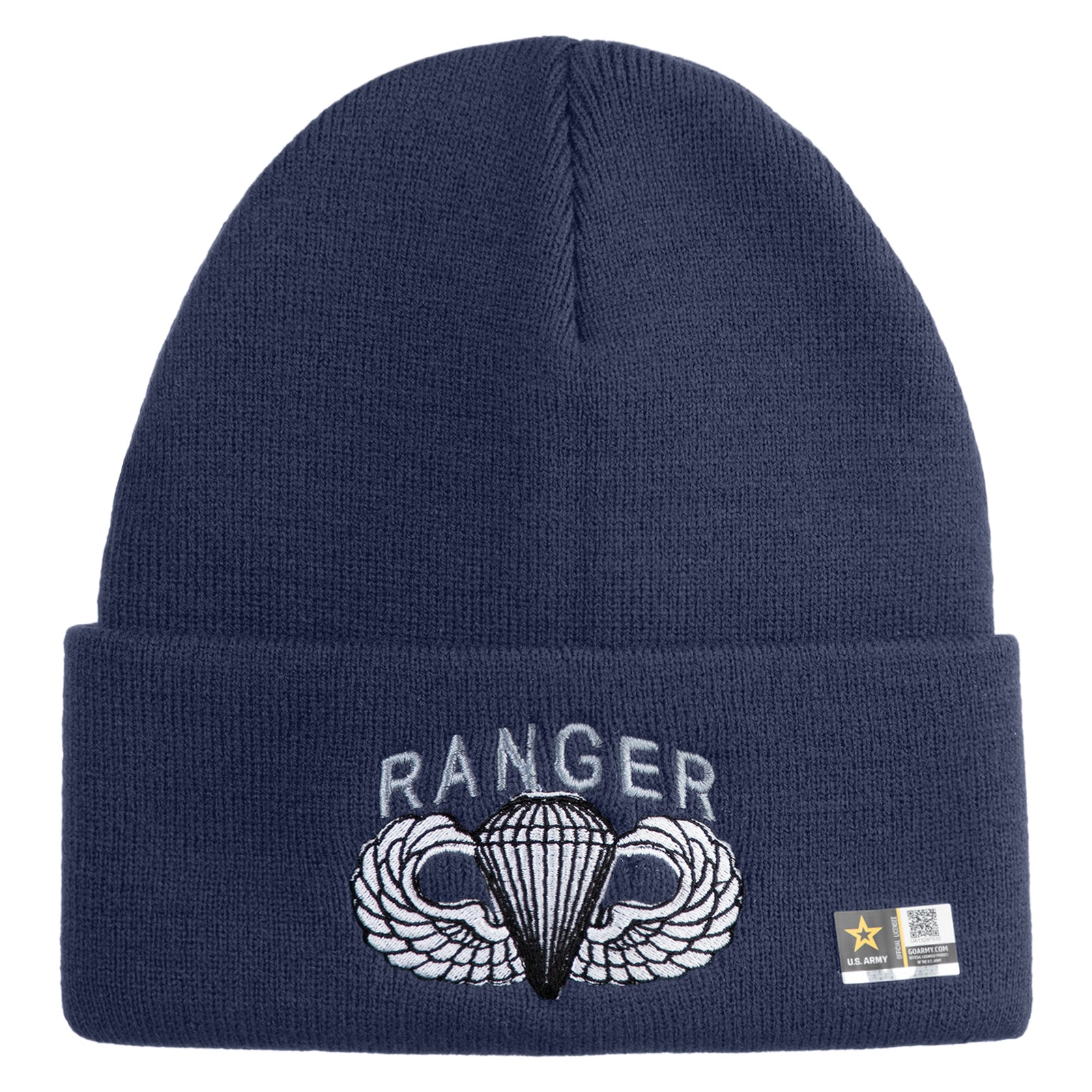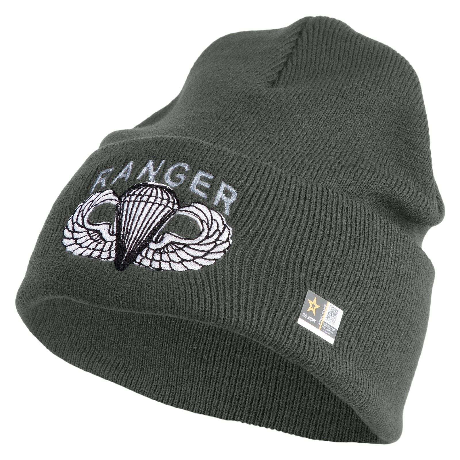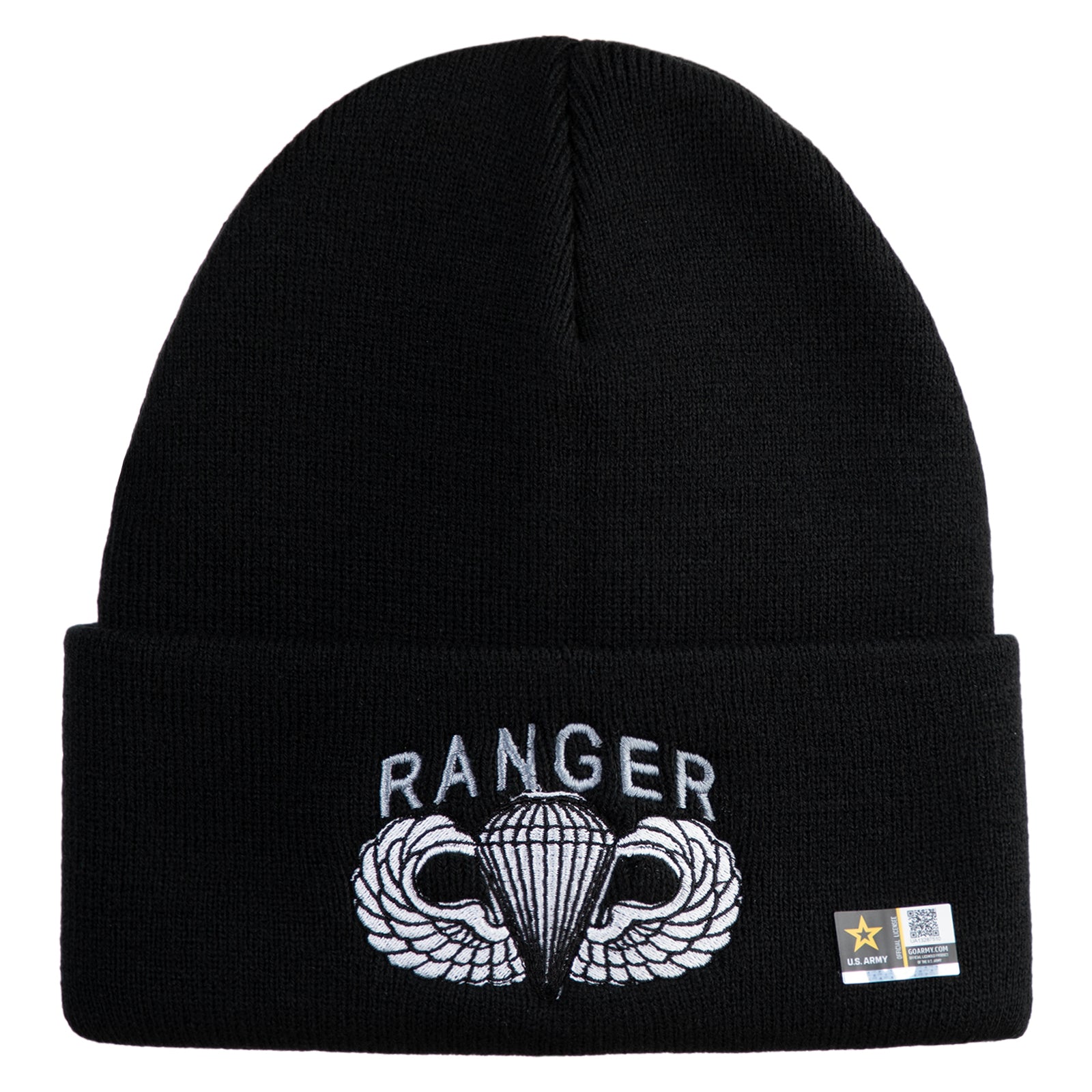 U.S. Army Paratrooper and Ranger Badge Logo Embroidered 12 Inch Solid Knit Cuff Long Beanie Made in USA