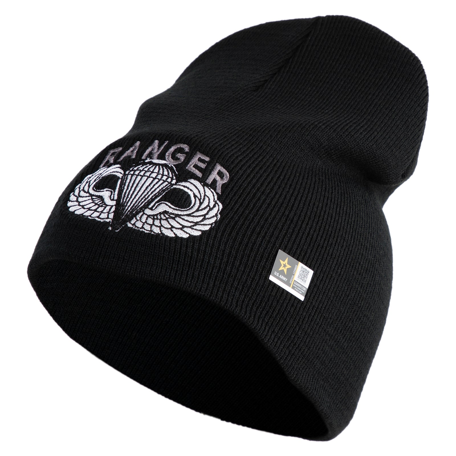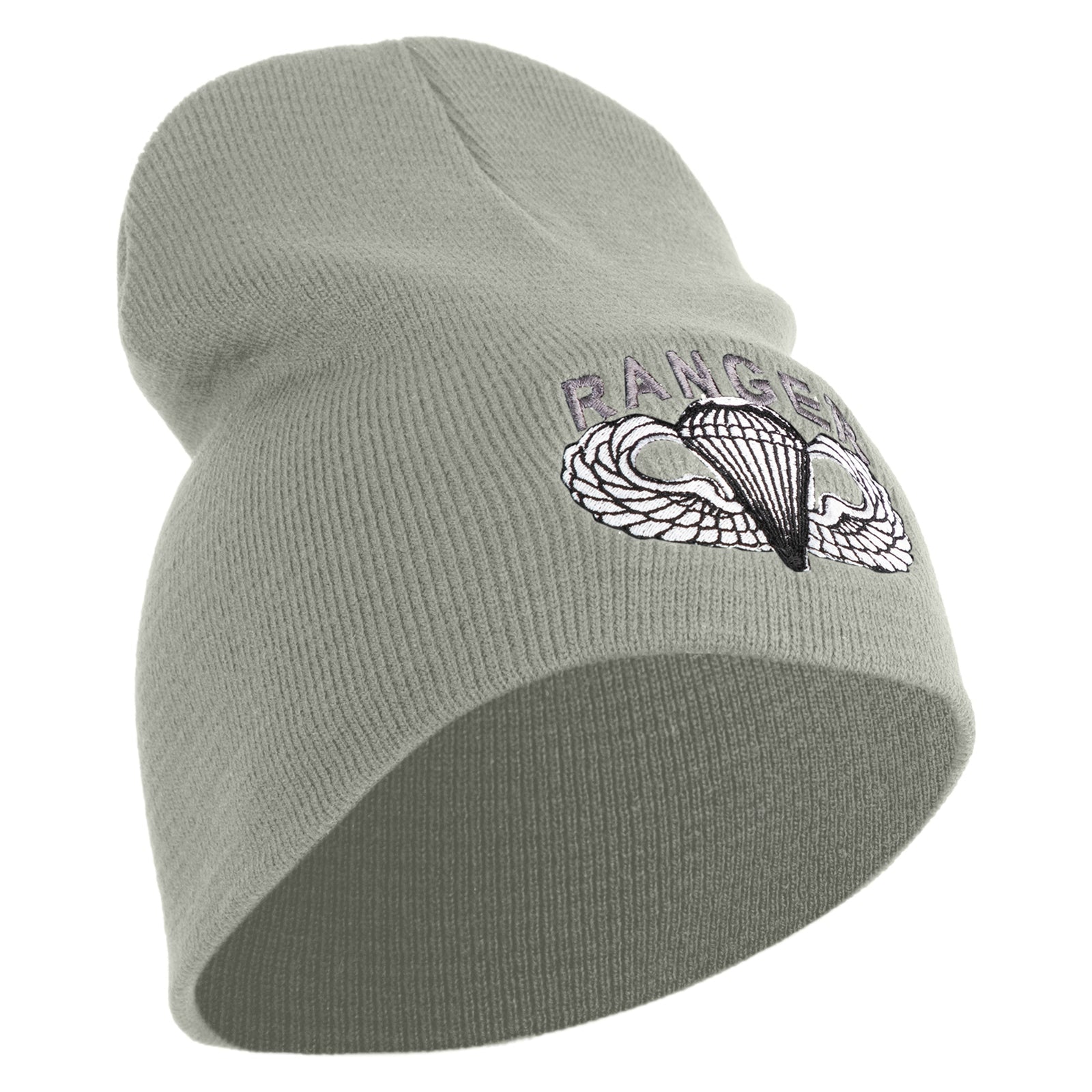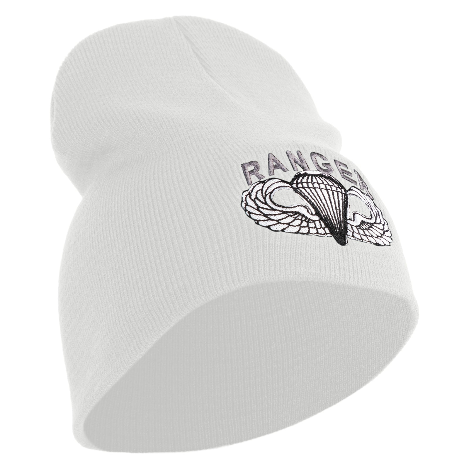 Title, U.S. Army Paratrooper and Ranger Badge Symbol Embroidered 8 Inch Solid Knit Short Beanie Made in USA