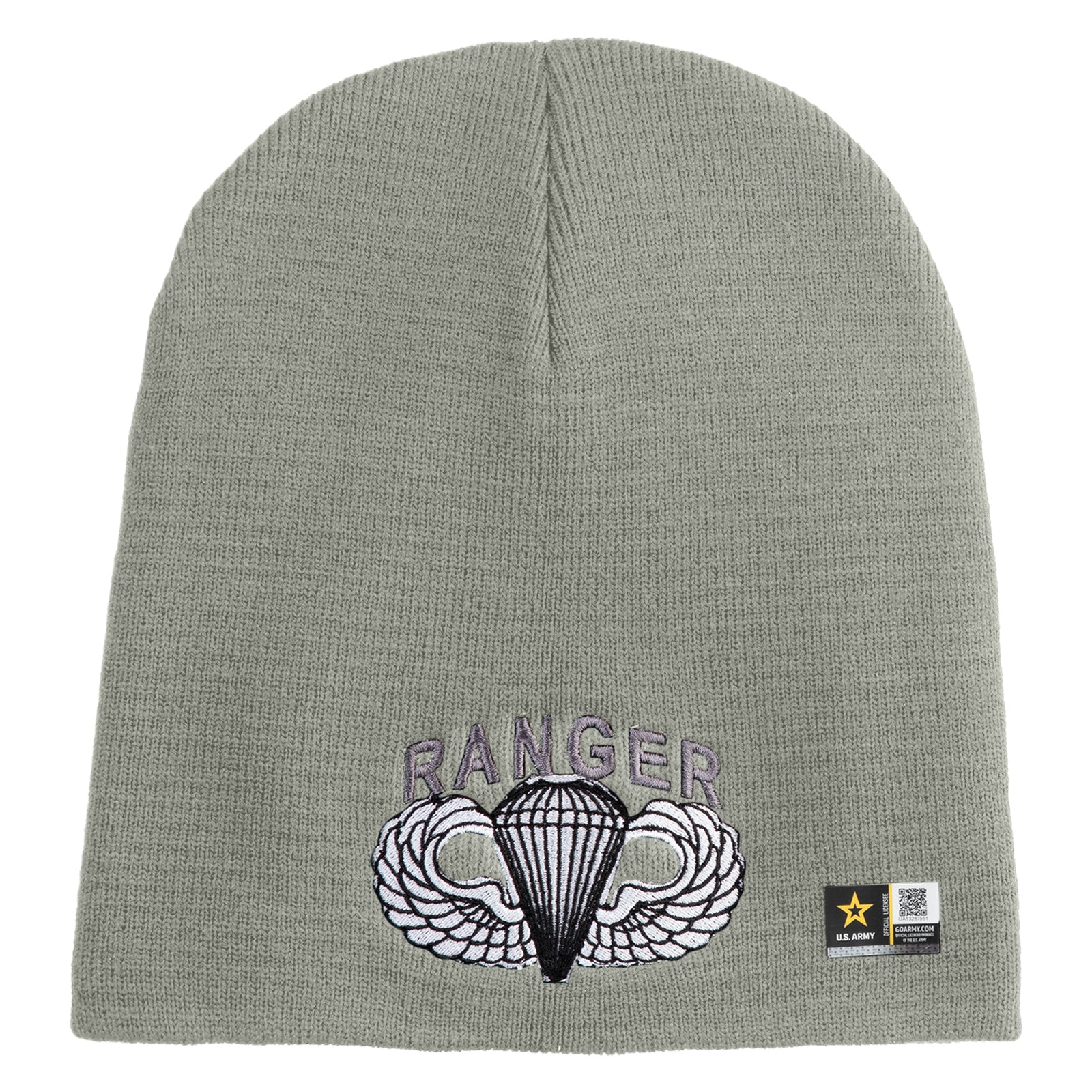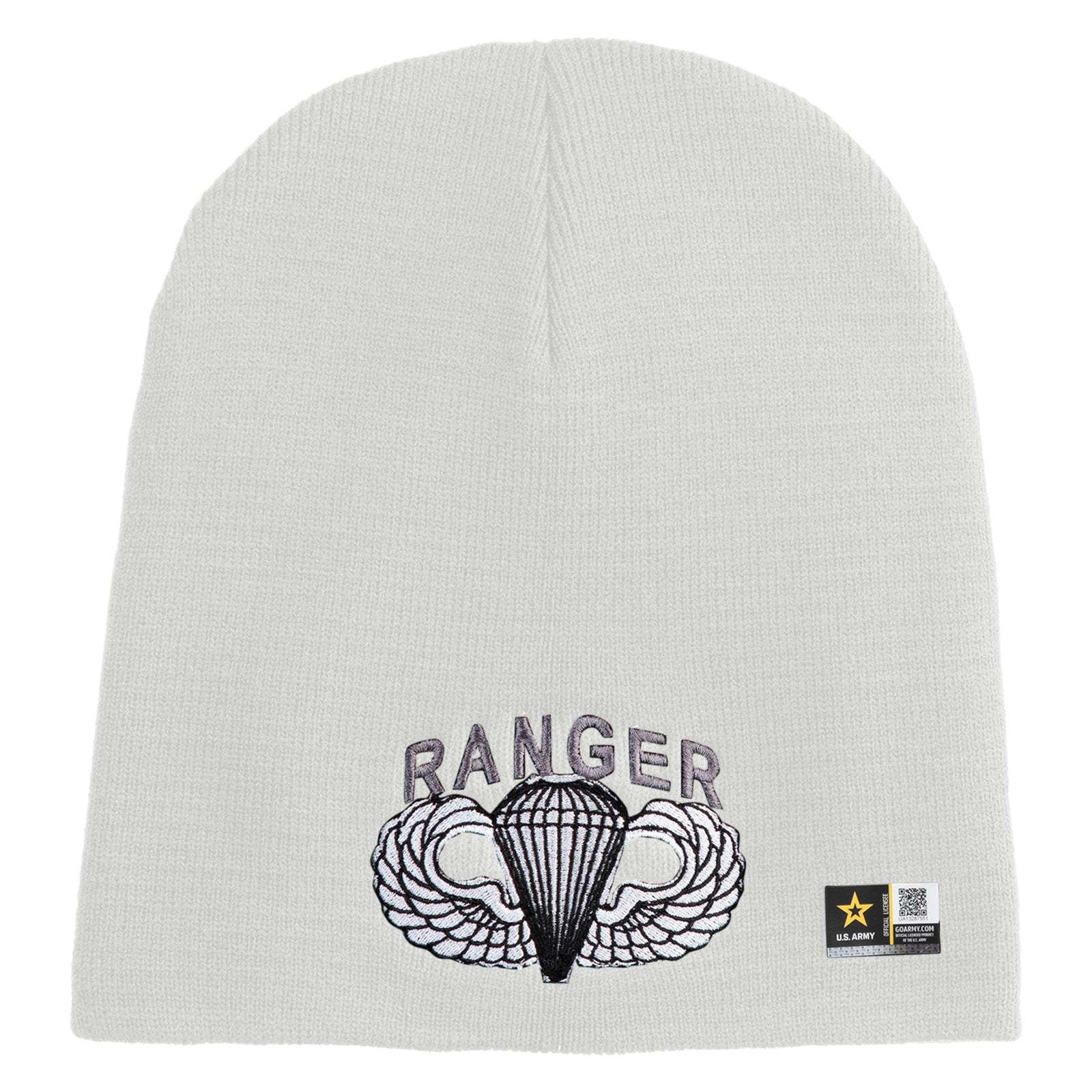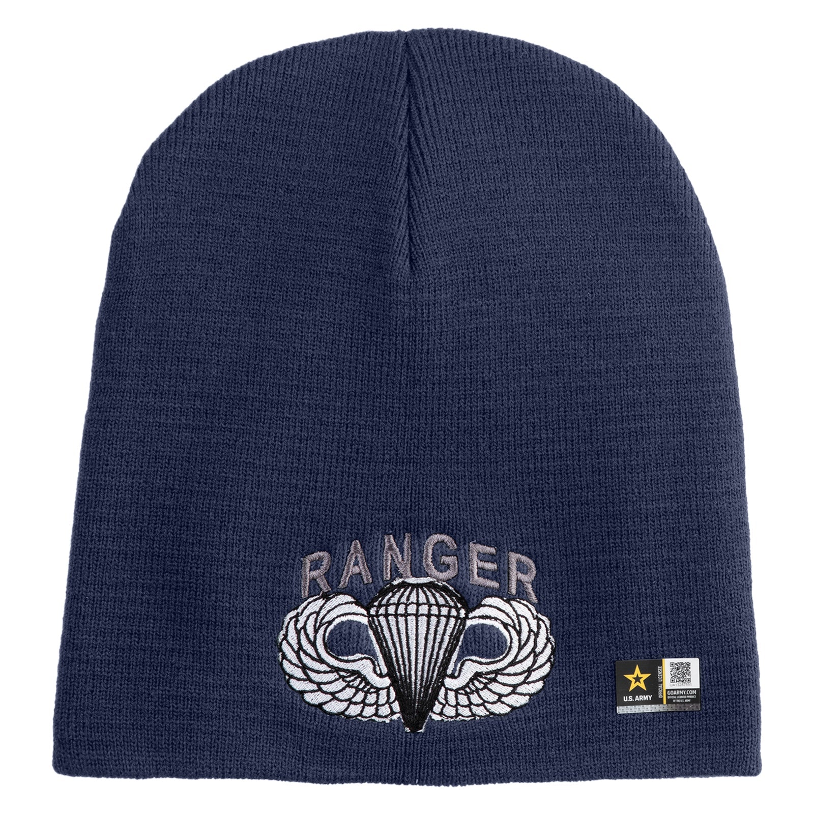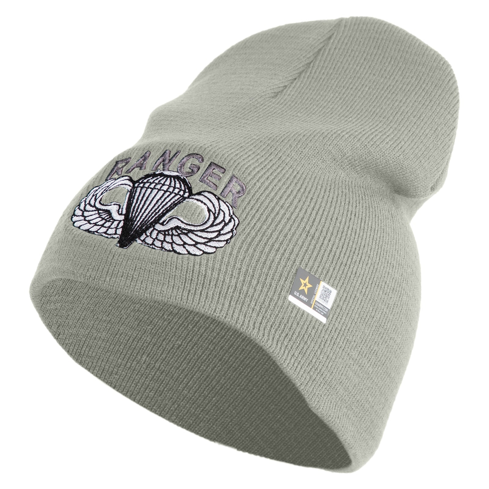 Title, U.S. Army Paratrooper and Ranger Badge Symbol Embroidered 8 Inch Solid Knit Short Beanie Made in USA