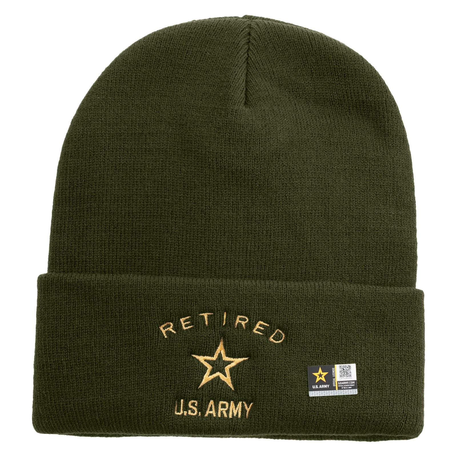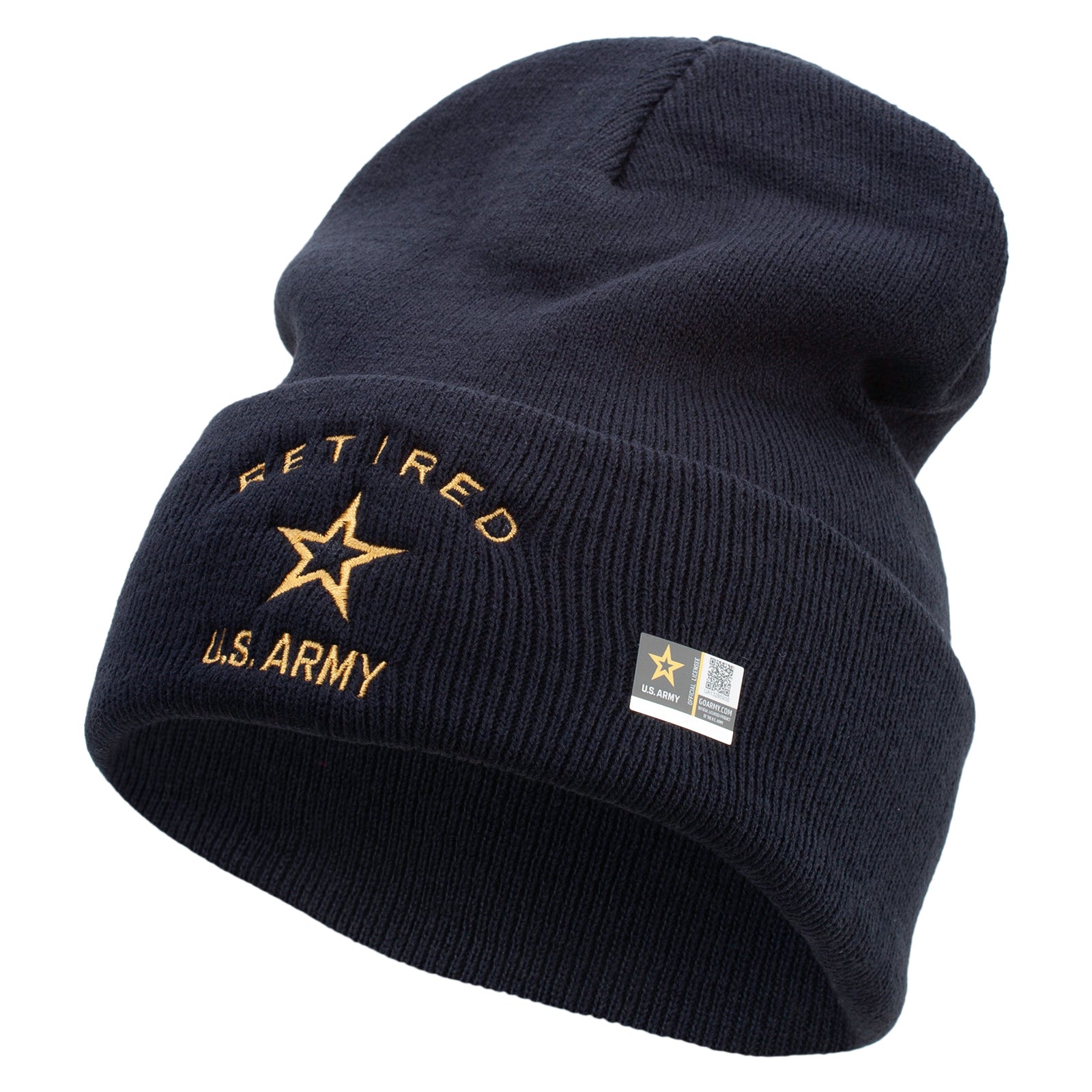 Title, Licensed US Army Retired Military Embroidered 12 Inch Solid Knit Cuff Long Beanie Made in USA