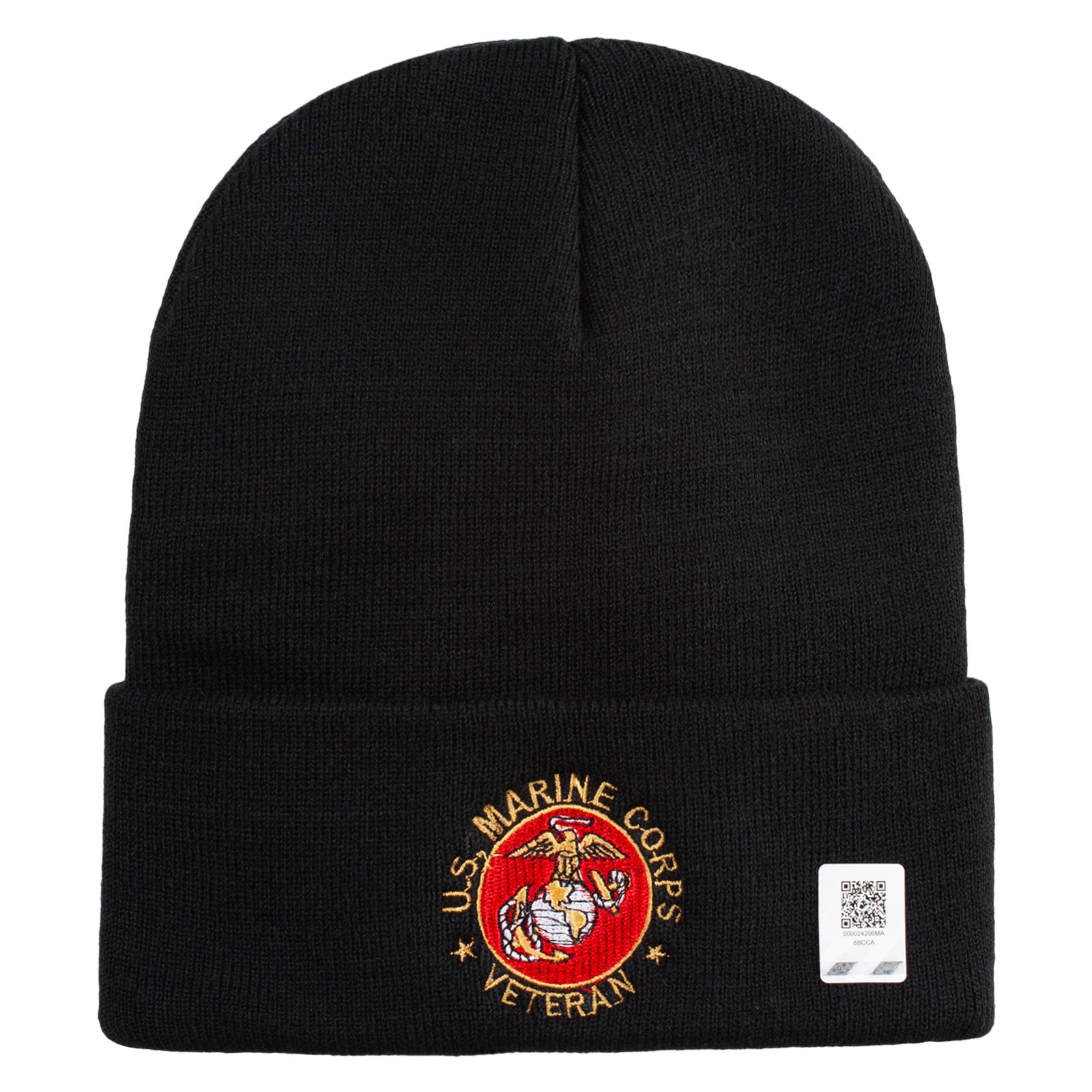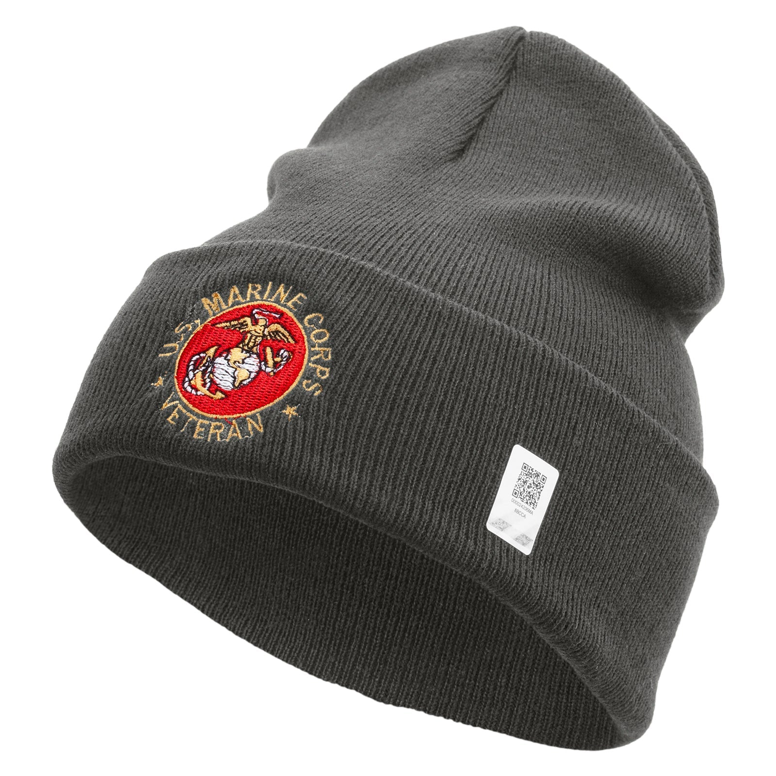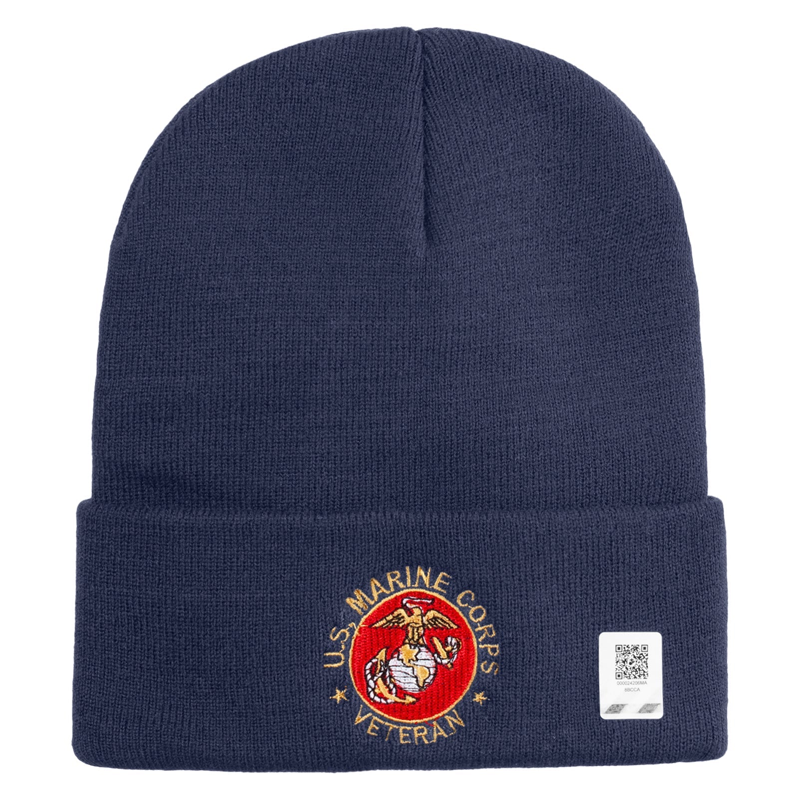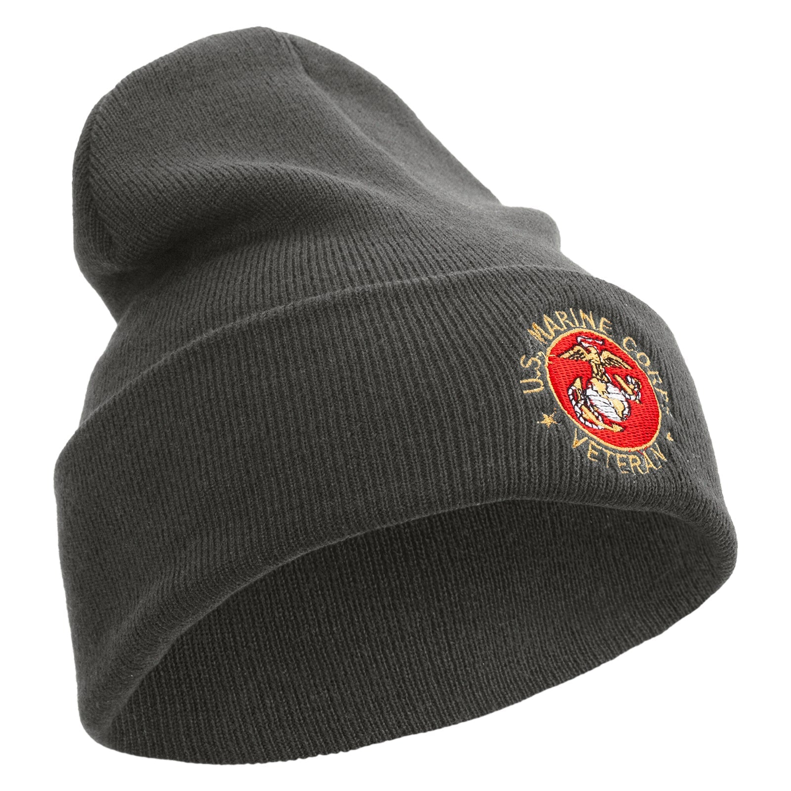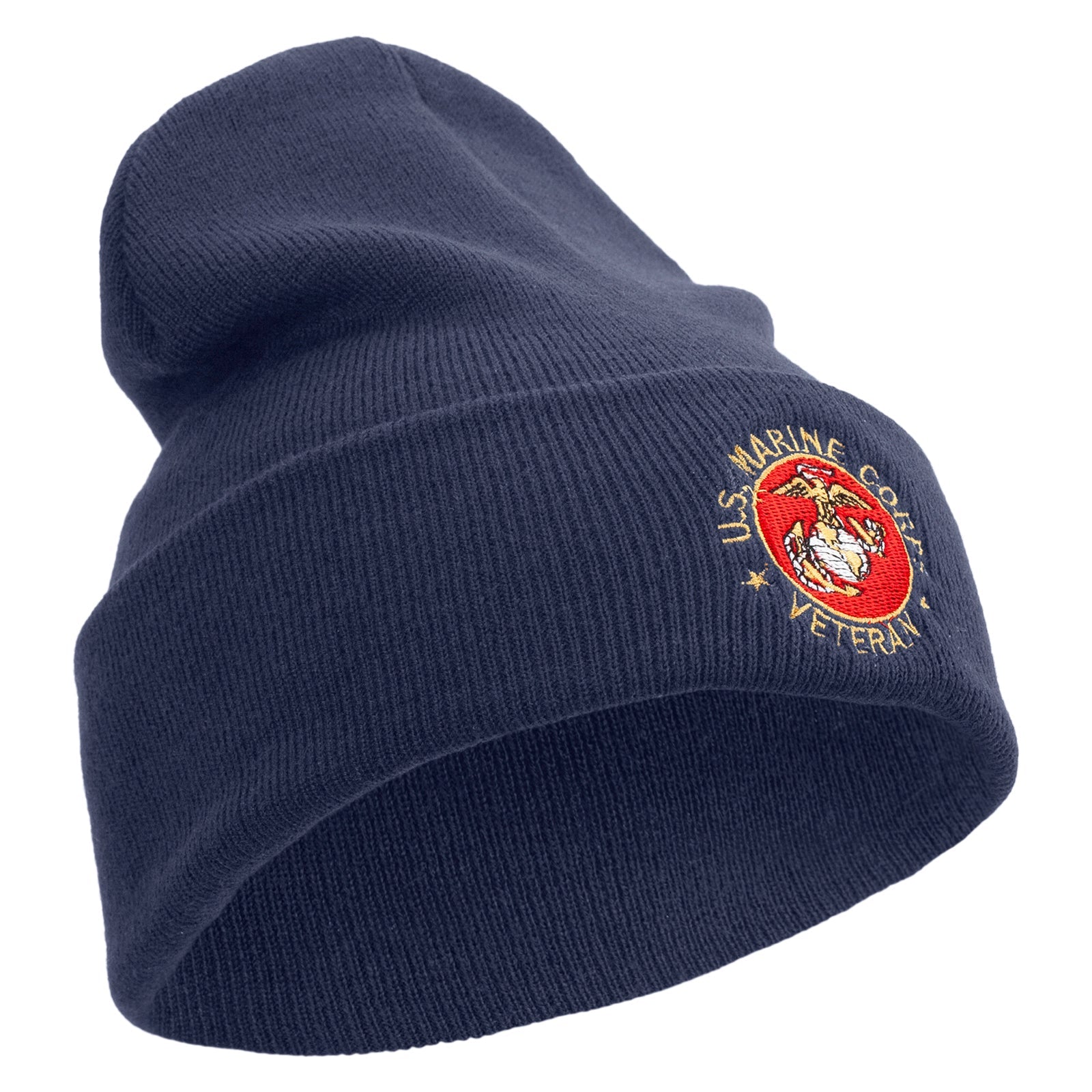 Title, US Marines Corps Veteran Emblem Logo Embroidered 12 Inch Solid Knit Cuff Long Beanie Made in USA