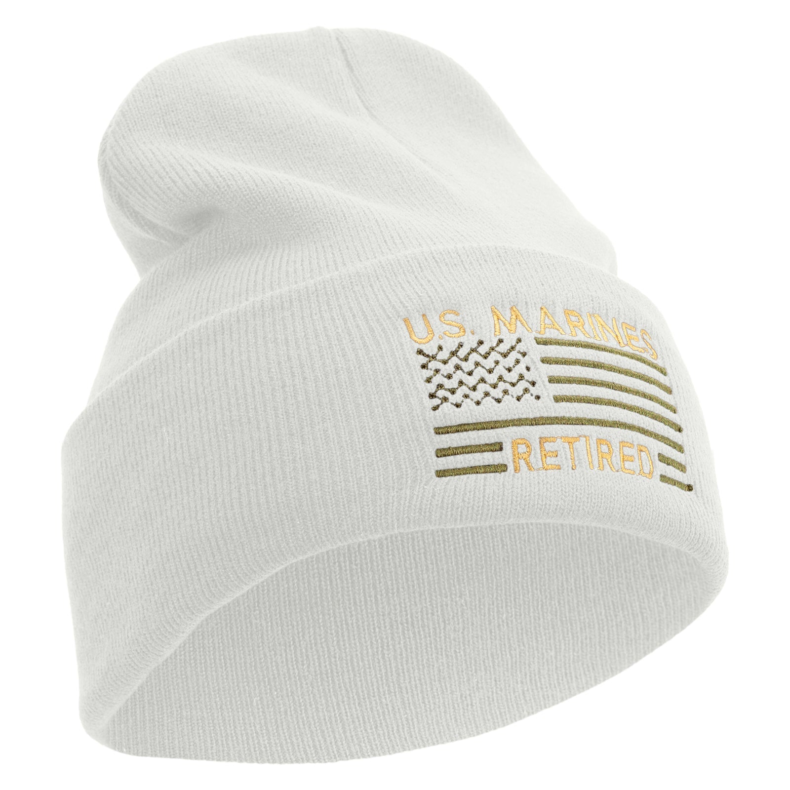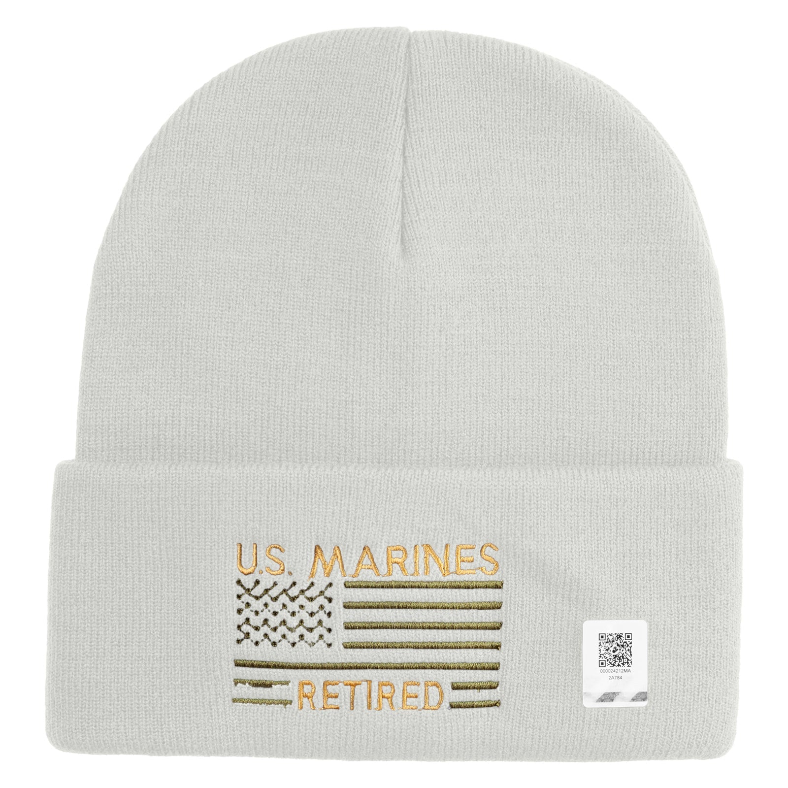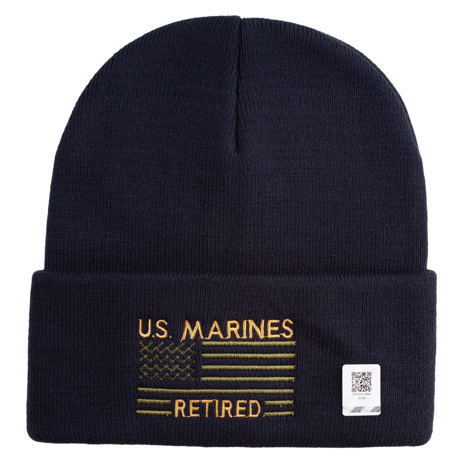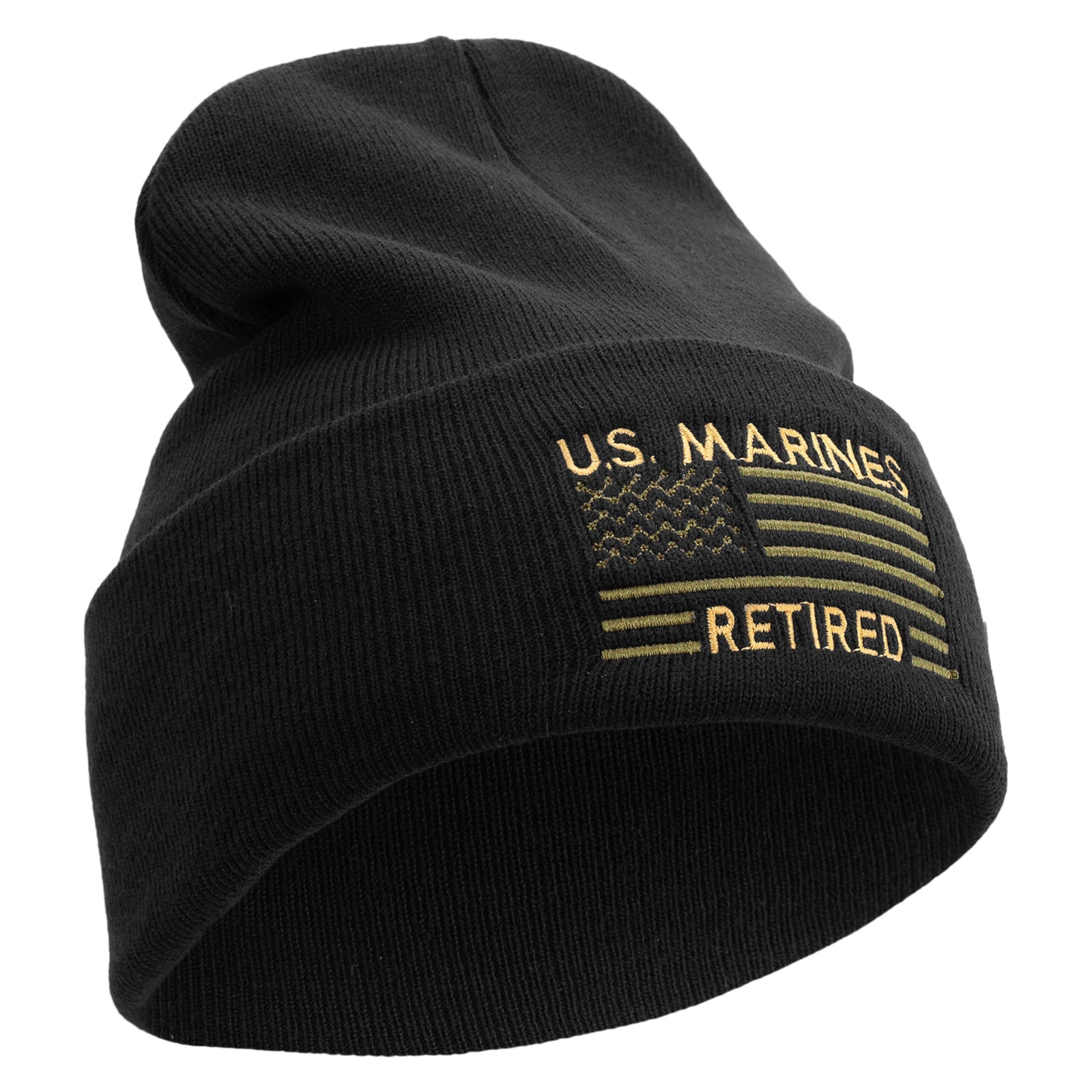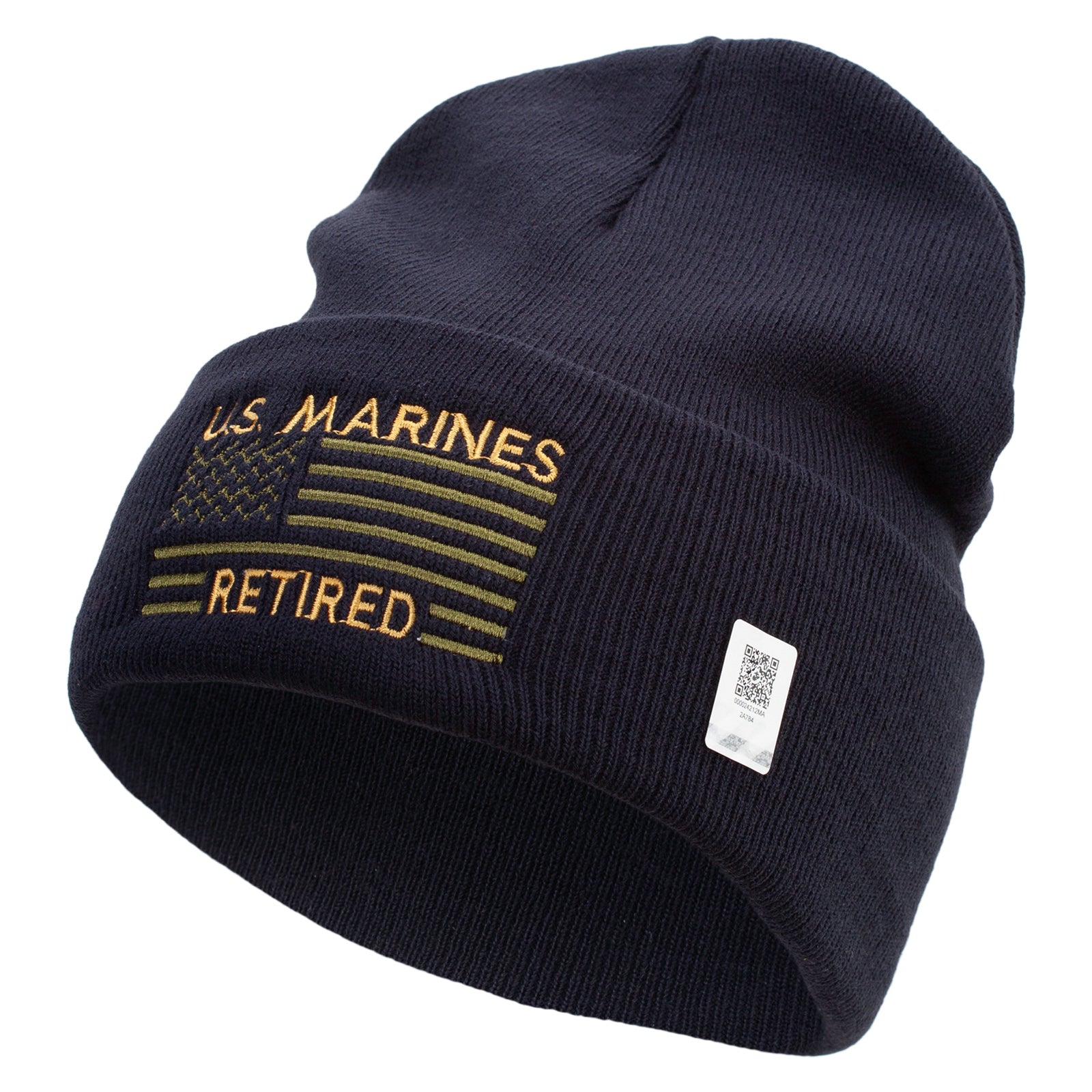 Title, US Marines Retired Flag Logo Embroidered Solid Knit Cuff Long Beanie Made in USA