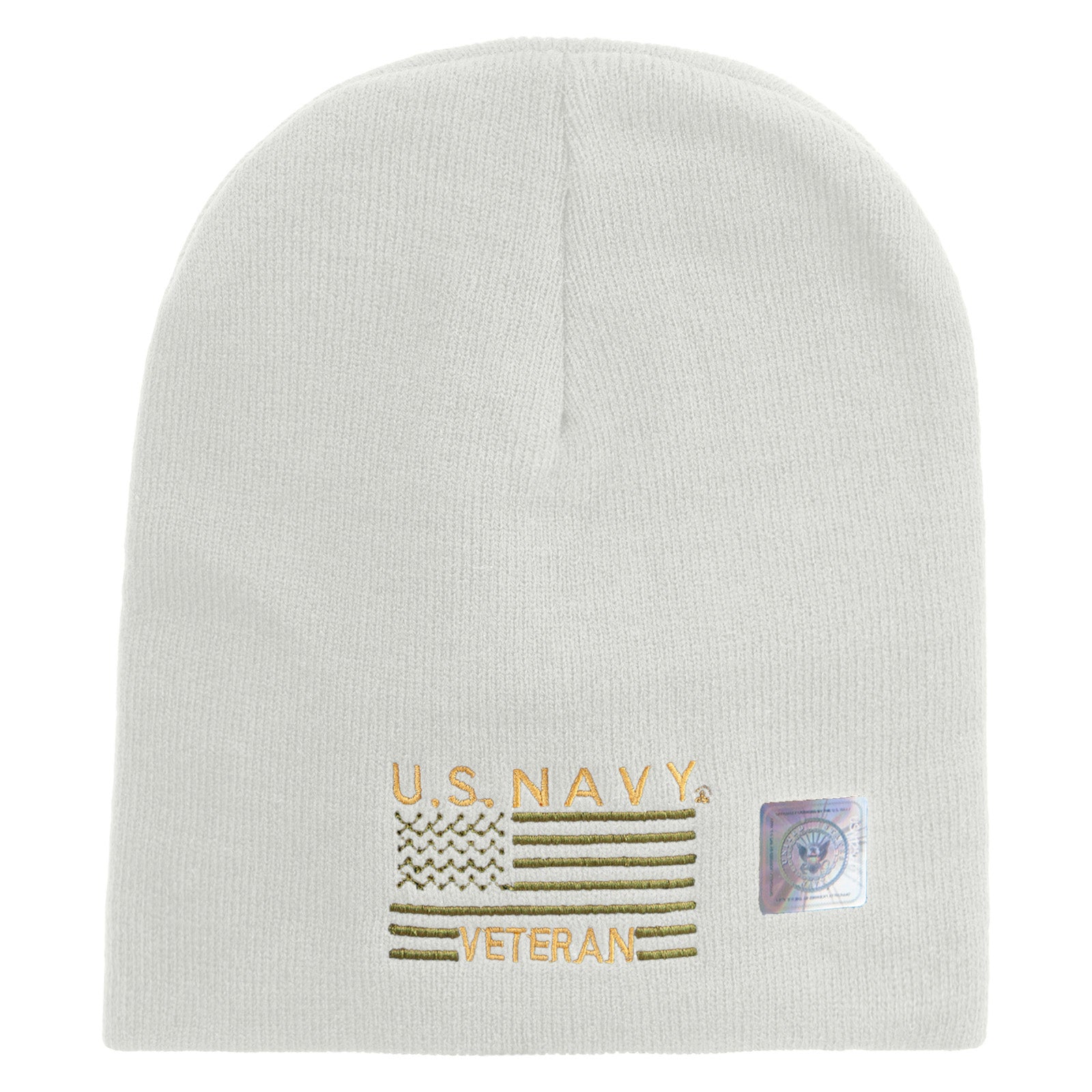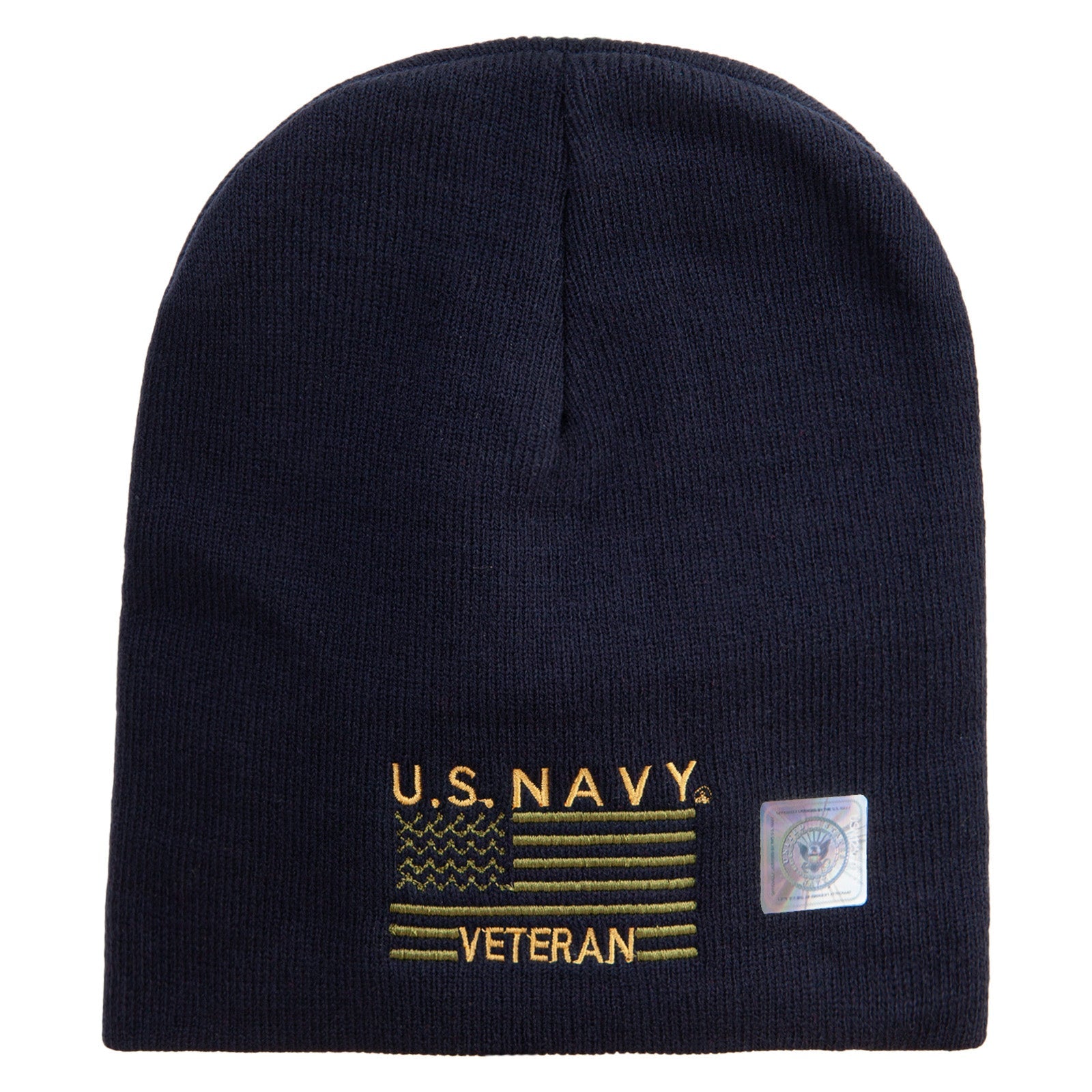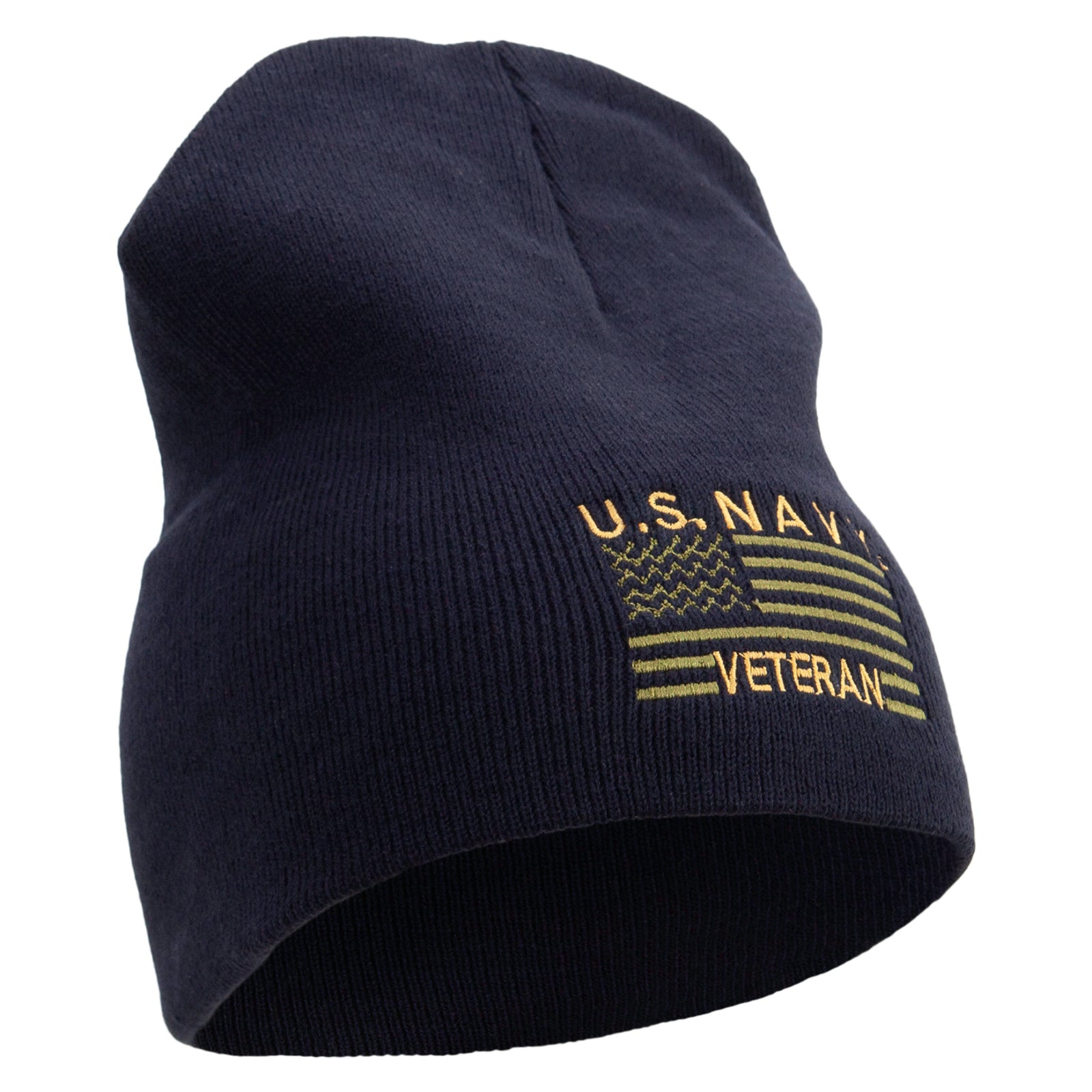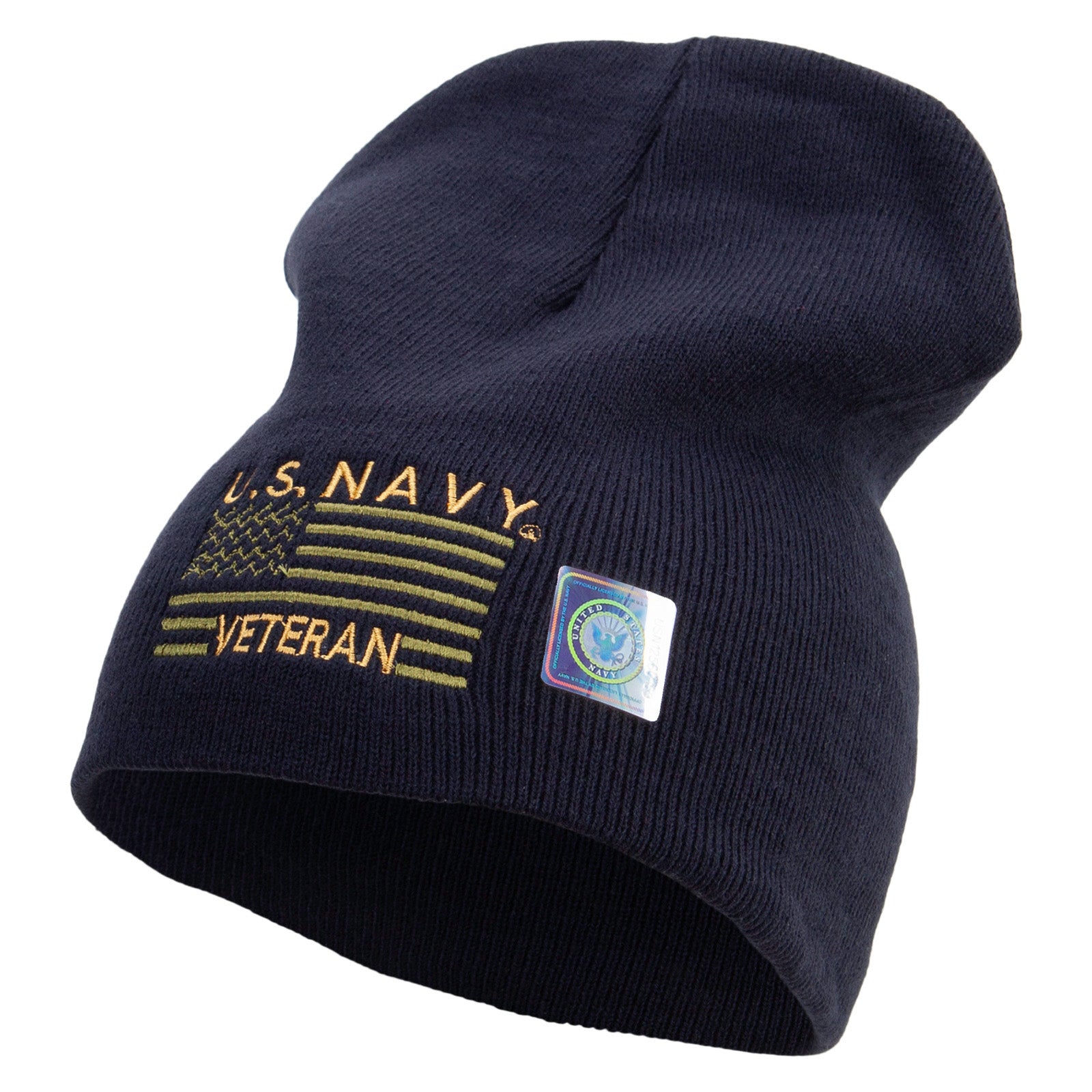 Product, Licensed Made in USA Navy Veteran Flag Symbol Embroidered 8 Inch Solid Knit Short Beanie
