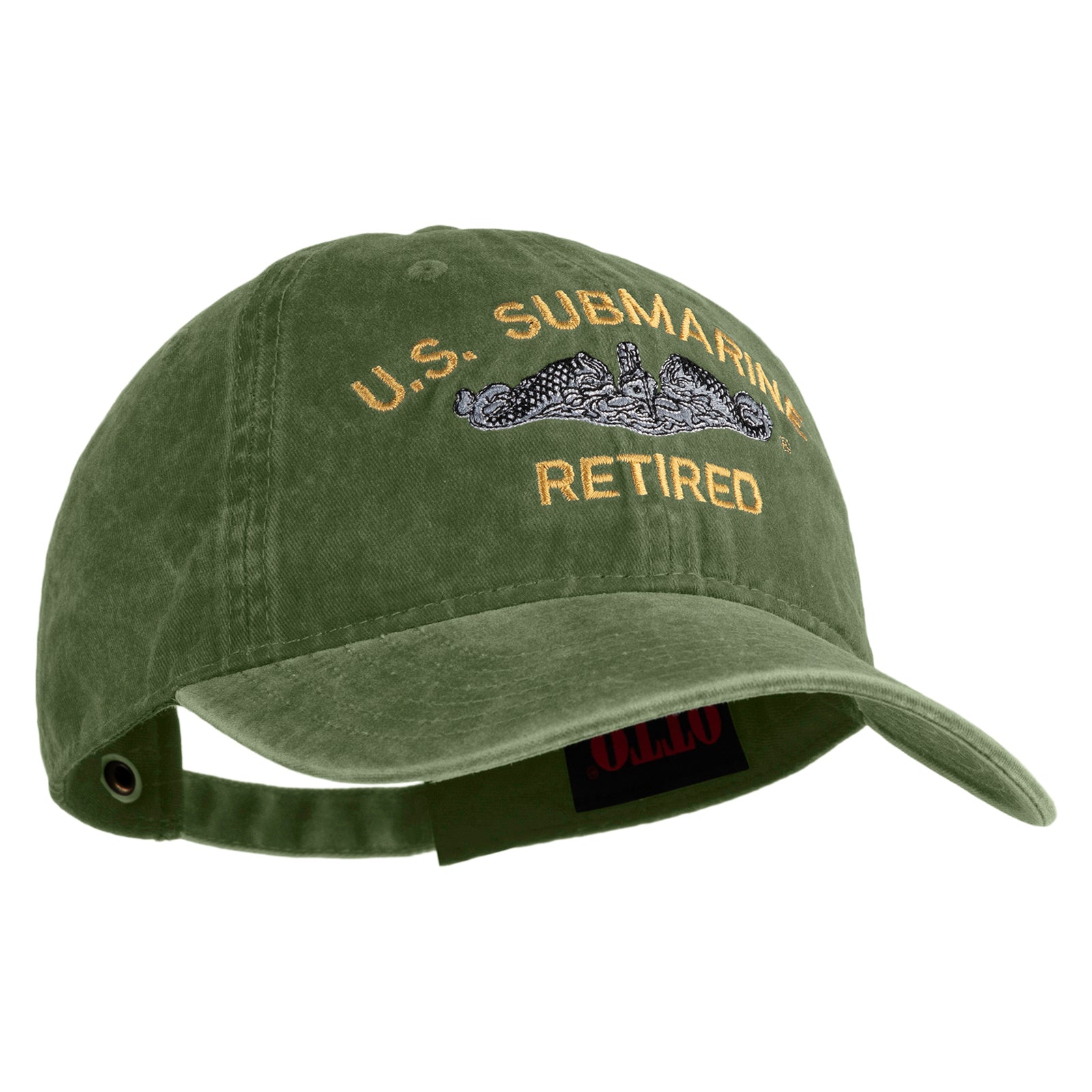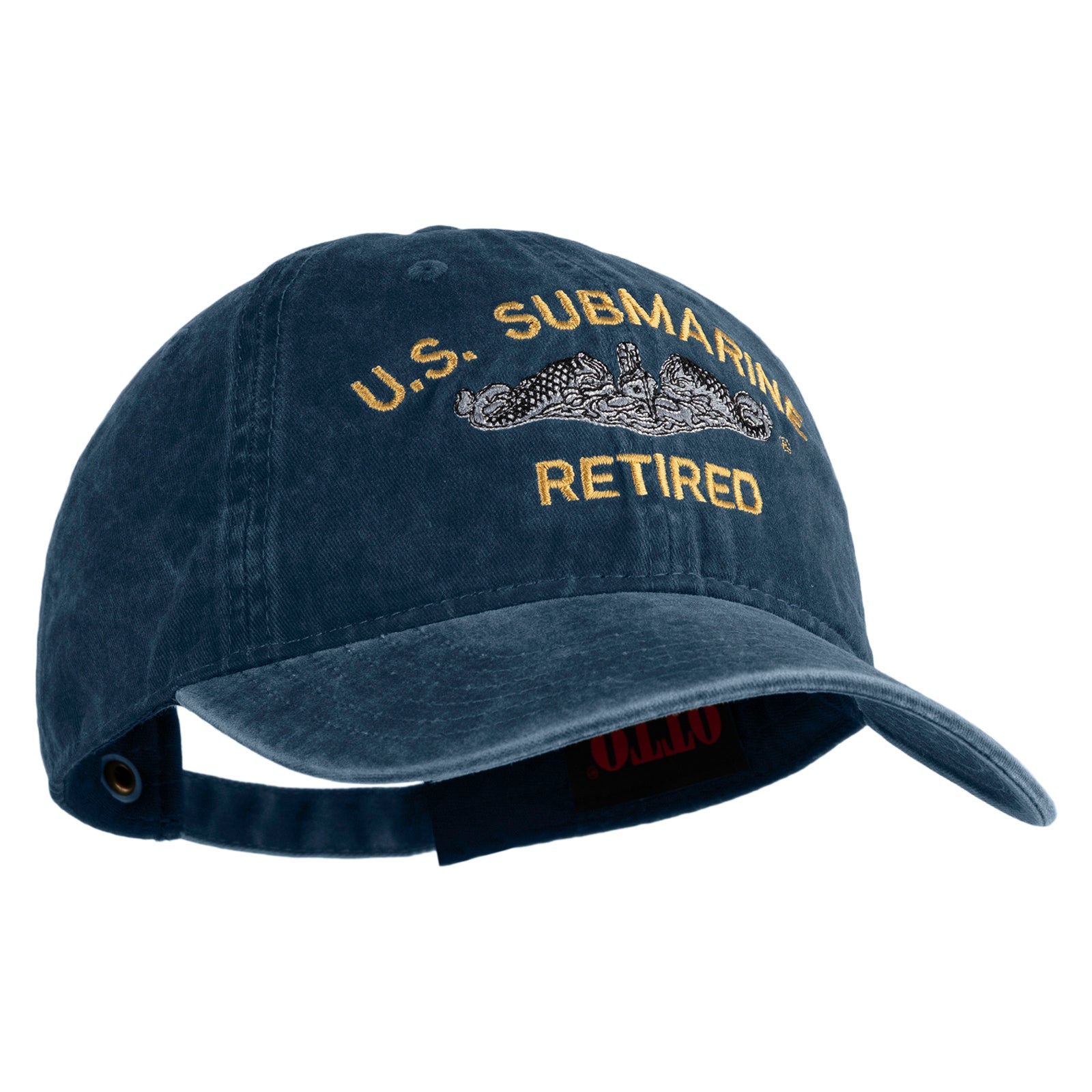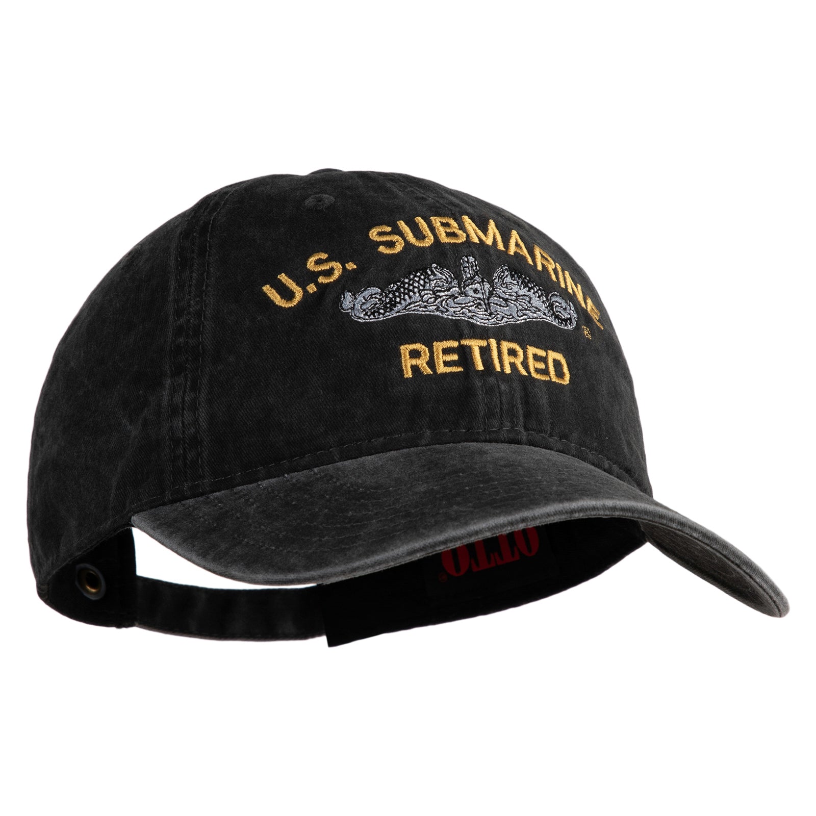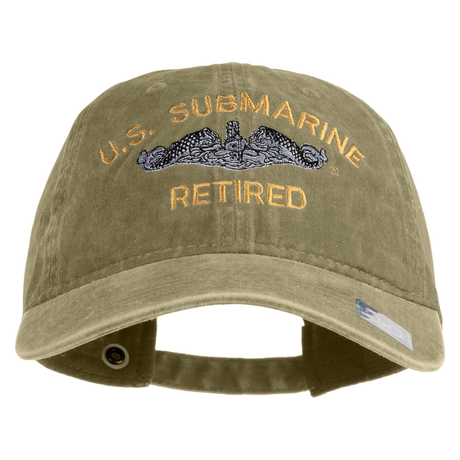 Title, US Submarine Retired Embroidered Washed Solid Pigment Dyed Cotton Twill Brass Buckle Cap