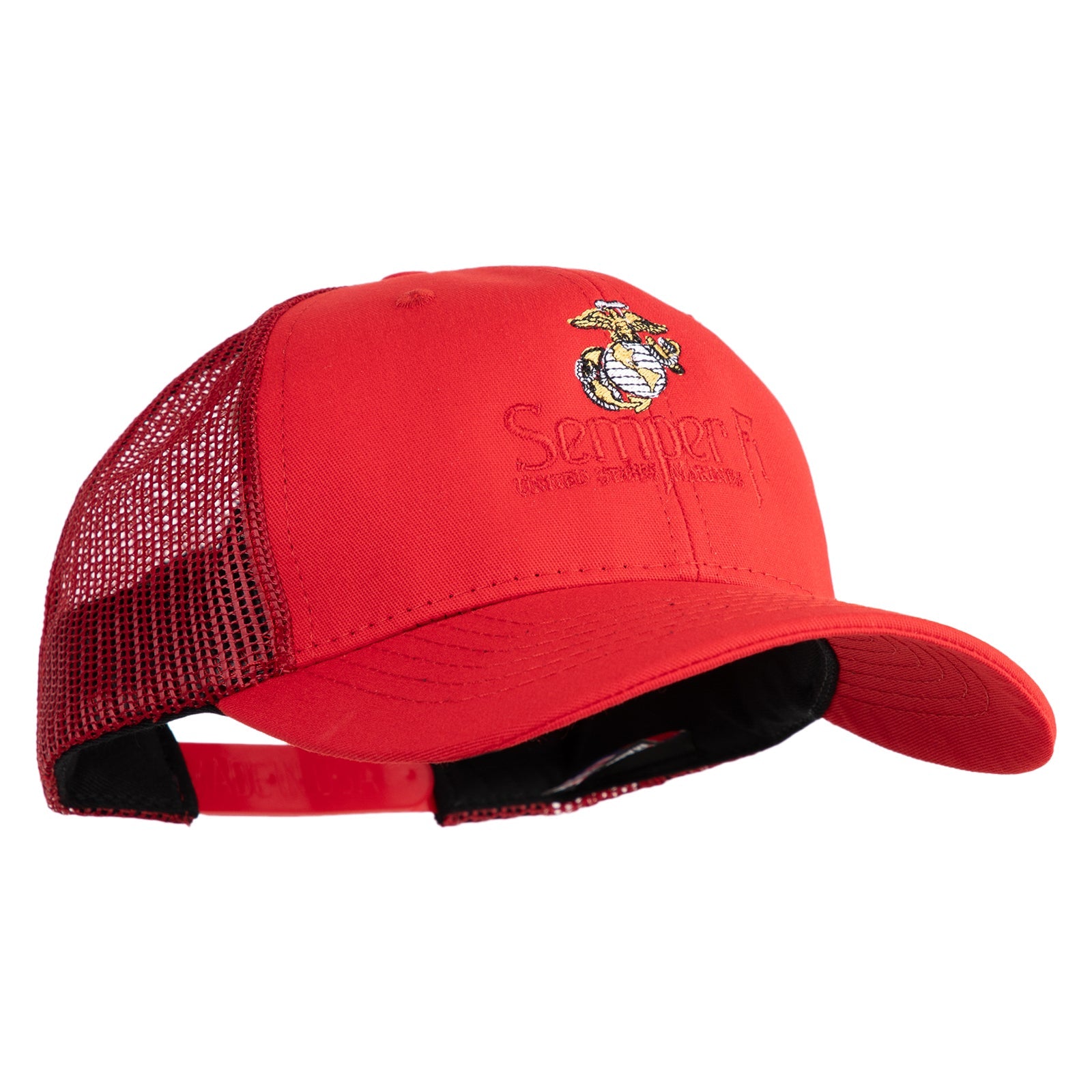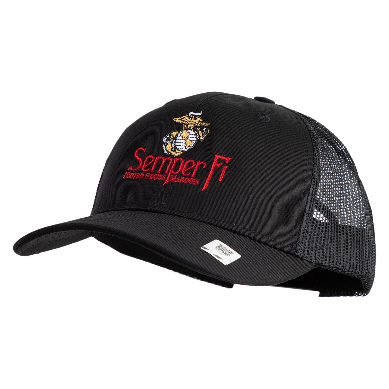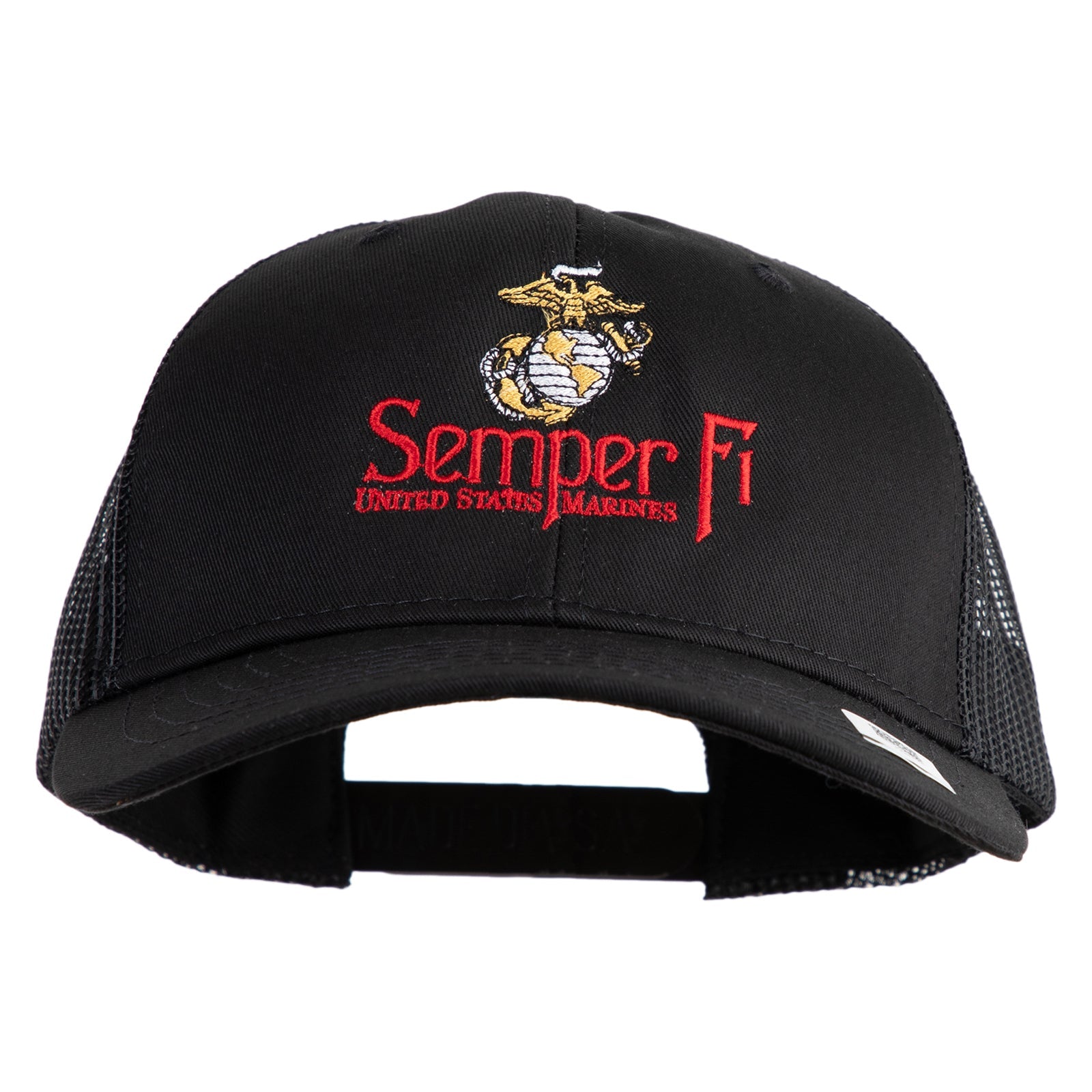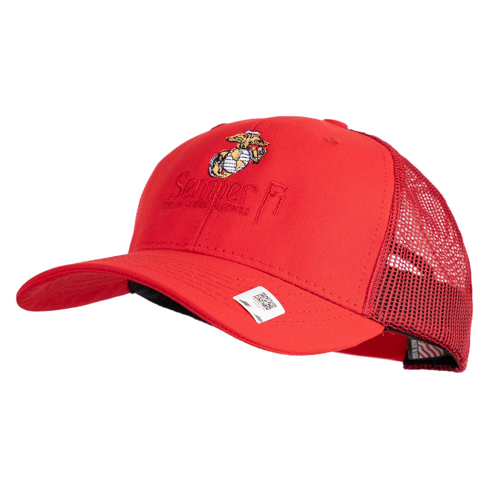 Title, United States Marines Semper Fi Emblem Embroidered 6 Panel Structured Cotton Twill Mesh Cap Made in USA