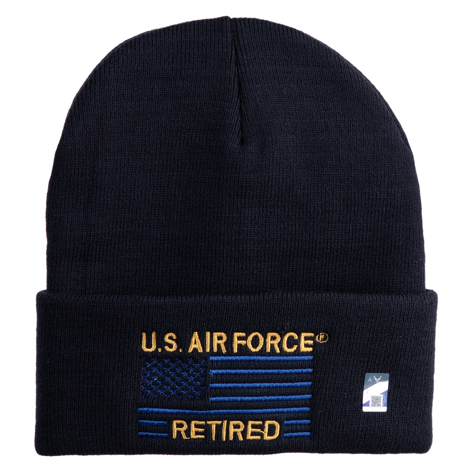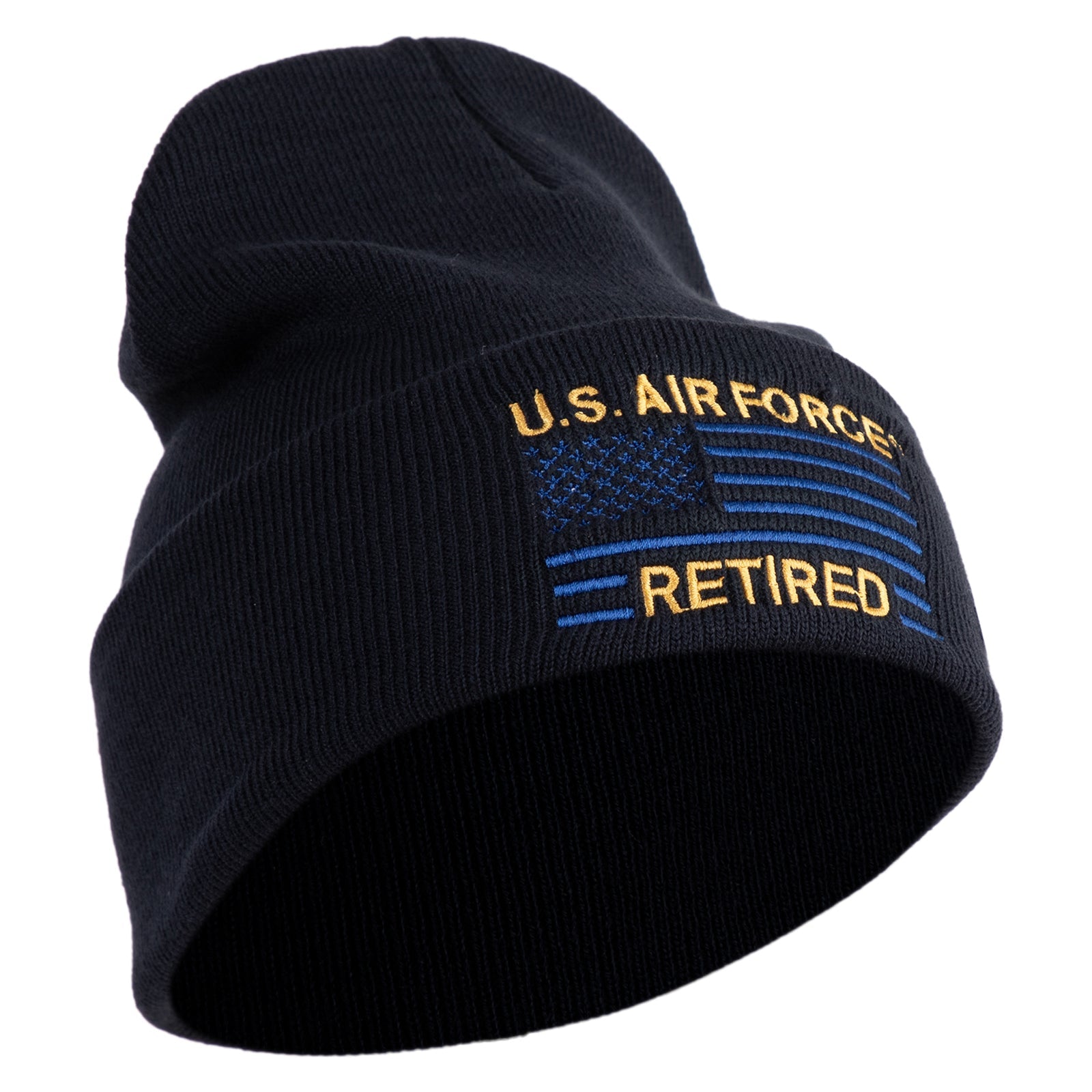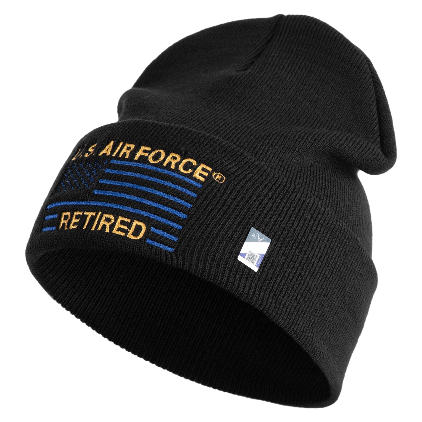 US Air Force Retired with Flag Logo Embroidered 12 Inch Solid Knit Cuff Long Beanie Made in USA