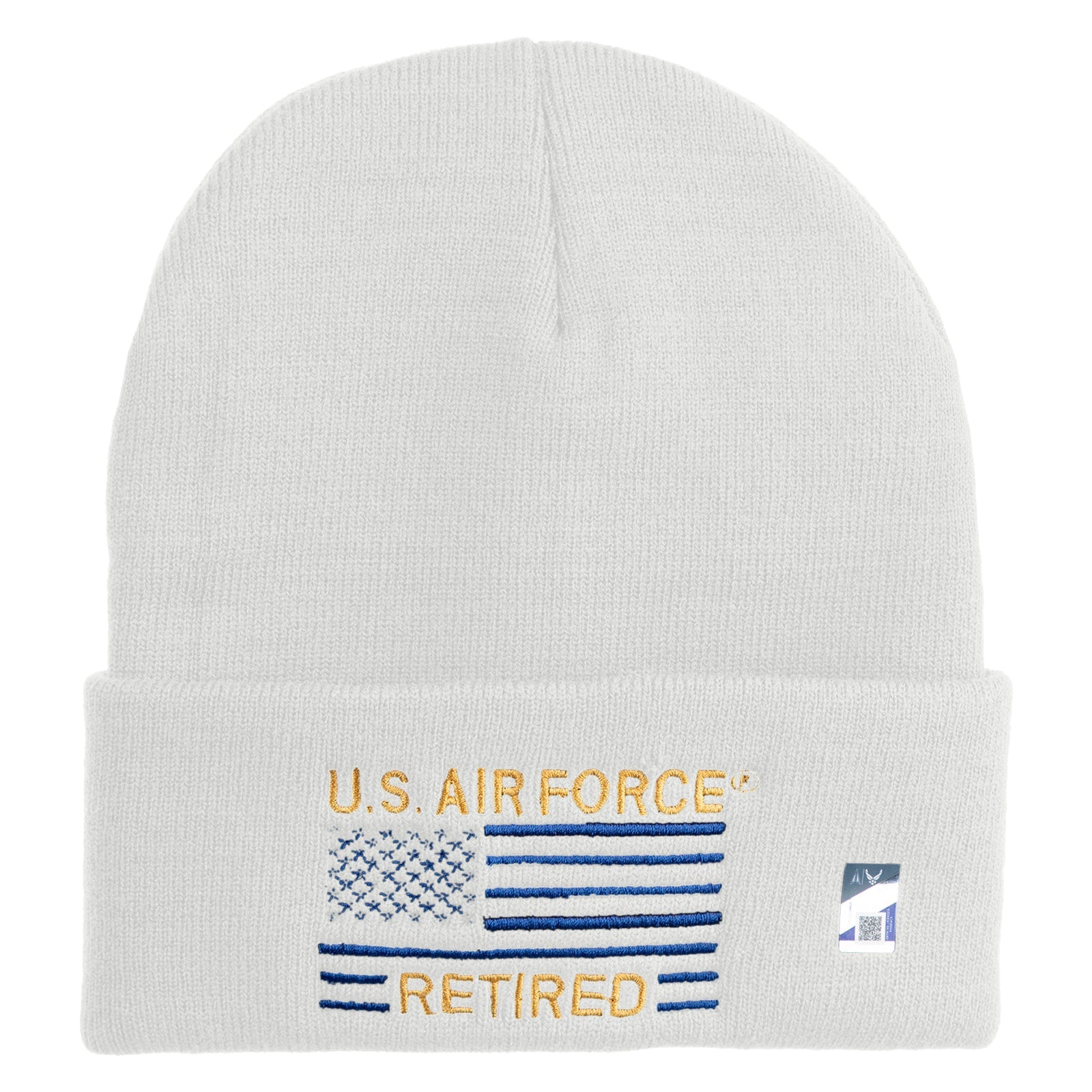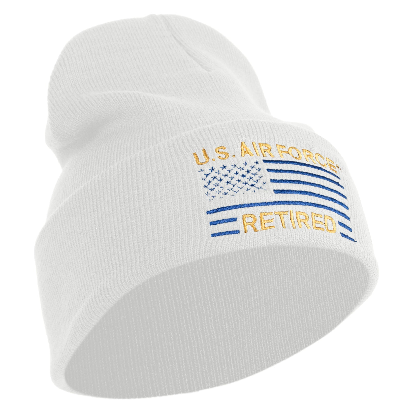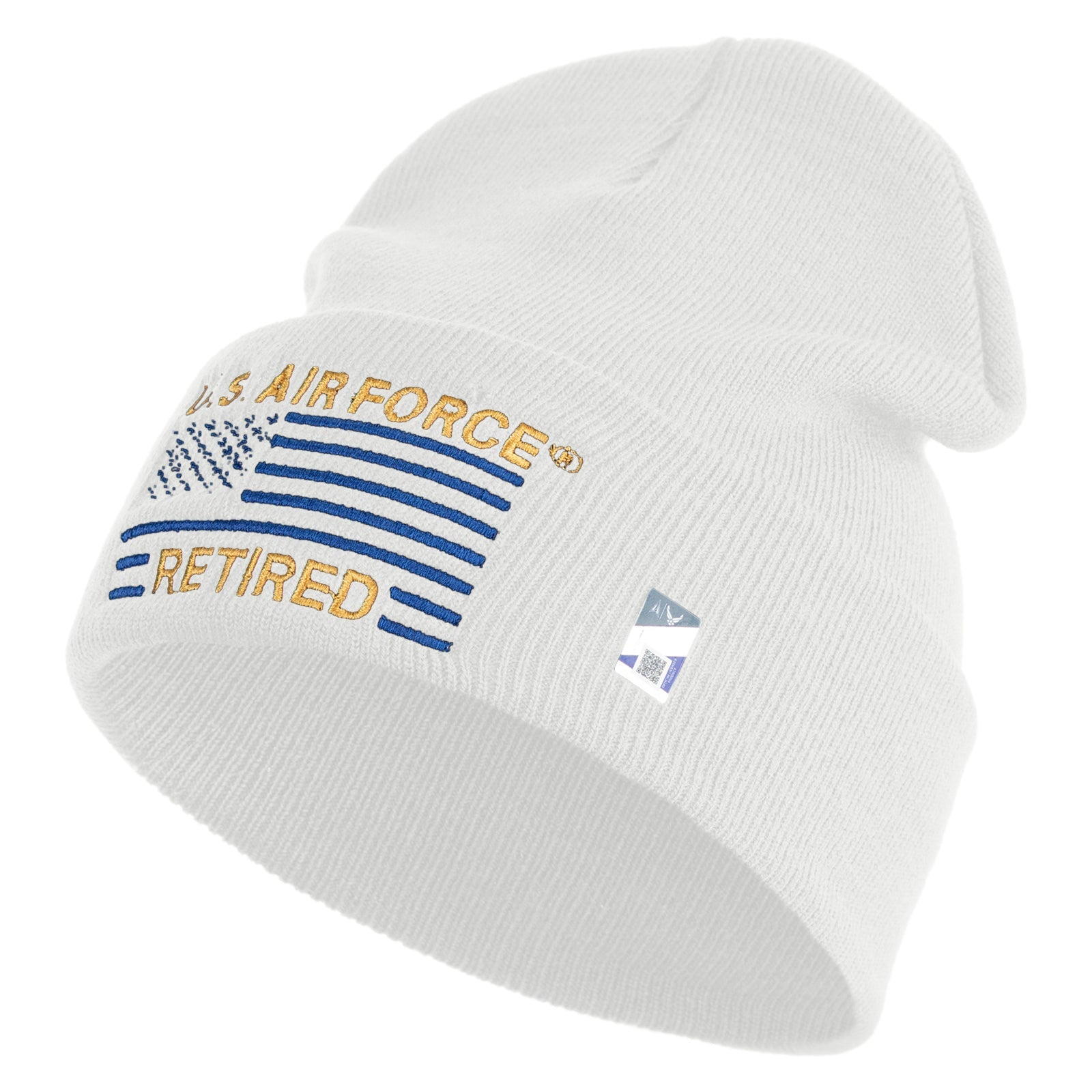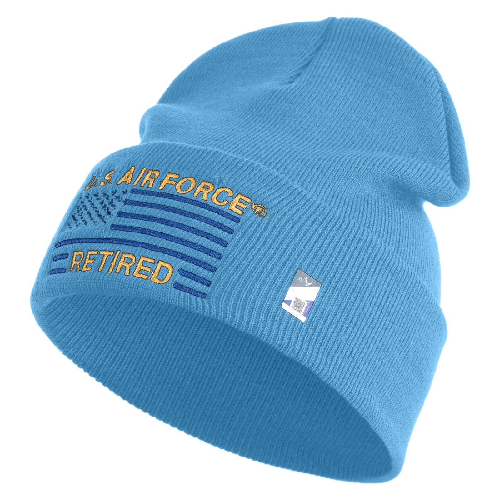 US Air Force Retired with Flag Logo Embroidered 12 Inch Solid Knit Cuff Long Beanie Made in USA